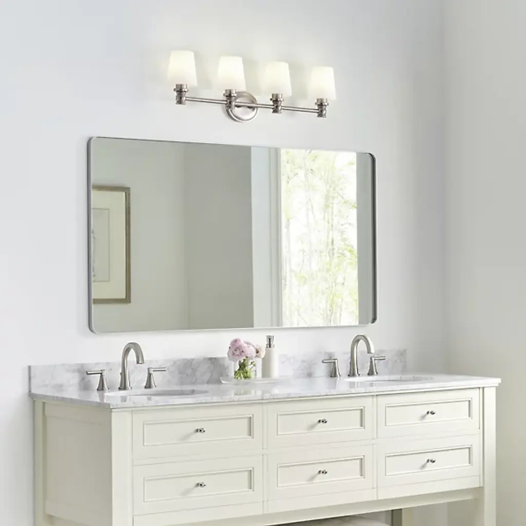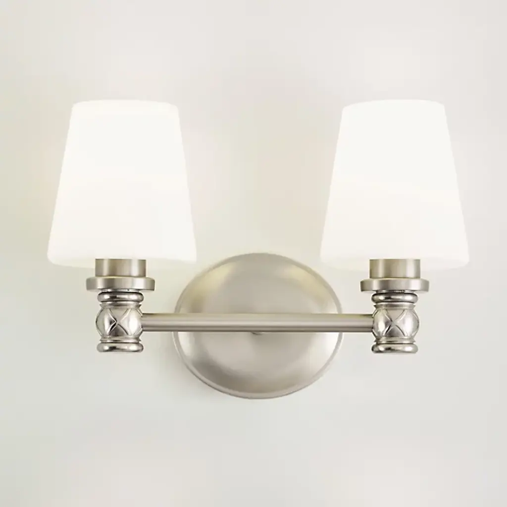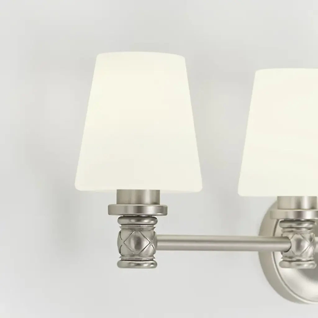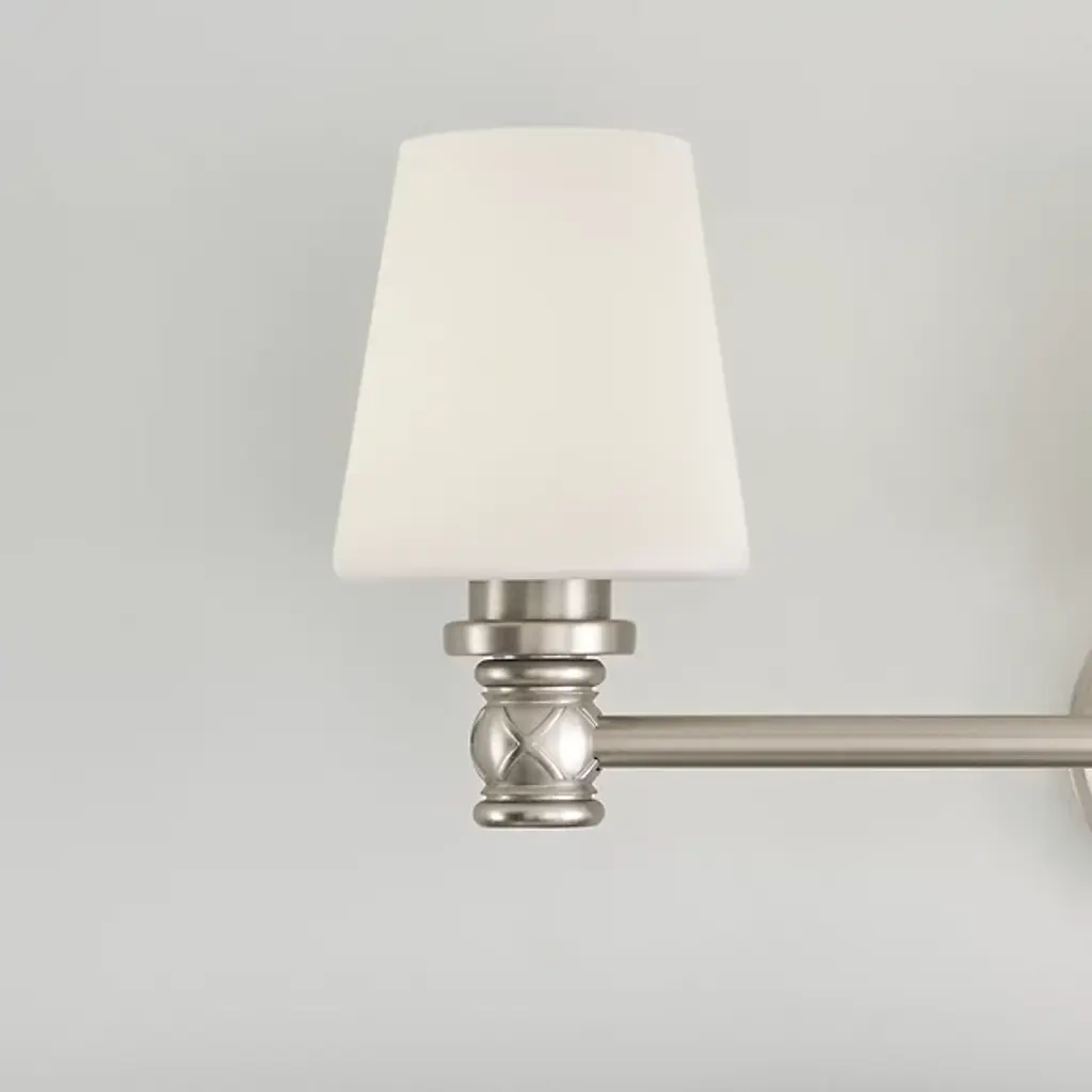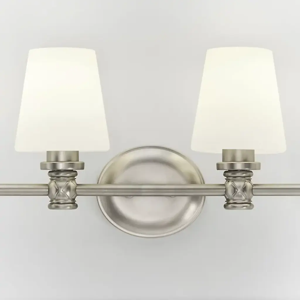 Give a fresh twist to bathroom decors with the Xavierre Vanity Light by Visual Comfort Studio, formerly known as Sean Lavin. This bath light stands out from the standard ones with its stylish silhouette and sophisticated design. The light fixture features a sleek metal bar which runs horizontally, connecting two lamp shades. Its metal holders are made with interesting x-shaped patterns that add an extra dimension to the design. This vanity light is verified for damp rating, making it a great choice for your bathrooms.