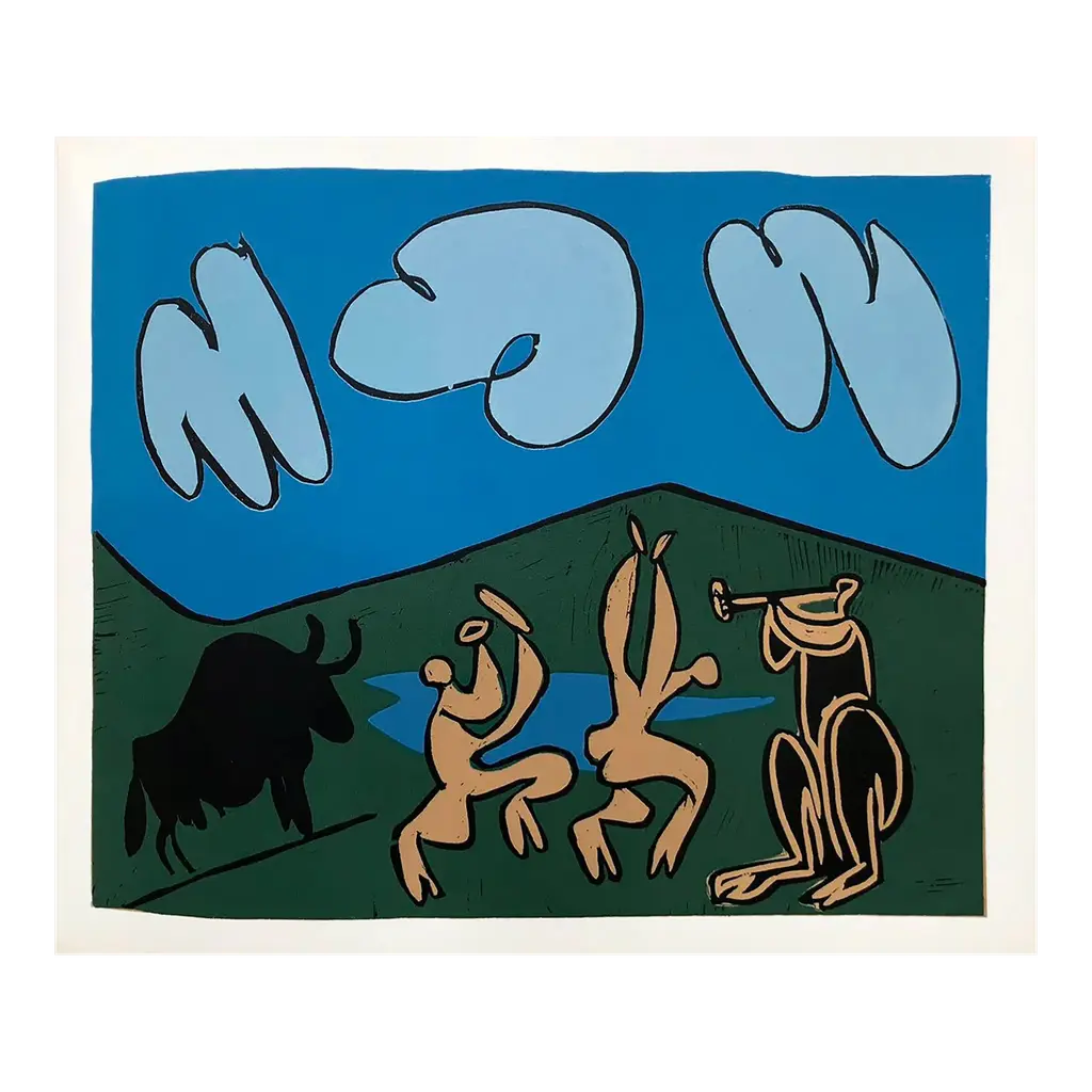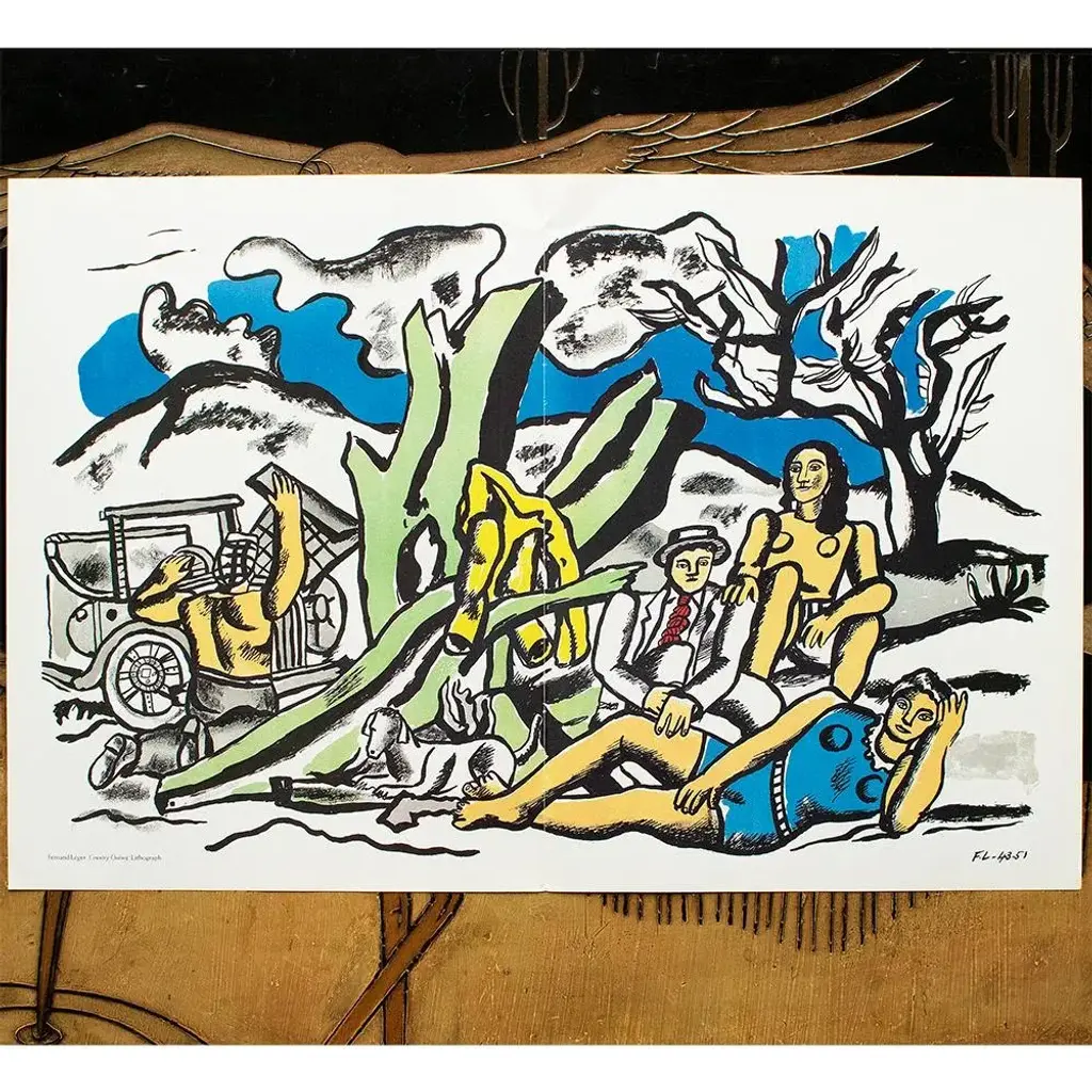 An excellent extra large full-color print of color lithograph "Country Outing" by Fernand Leger, first published in N27/28 issue of Verve magazine, in December 1952. This is second edition printed in Switzerland in 1987, in a rare art book dedicated to Verve. Superb quality. Detailed. Illustrations from Verve and copy is printed on back. Excellent condition - minor edge wear, a fold through the center, never framed. Overall 20.75"W x 13.90"H