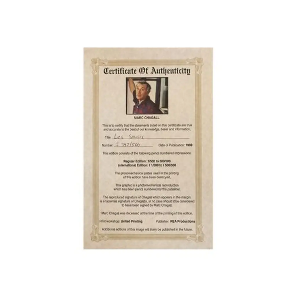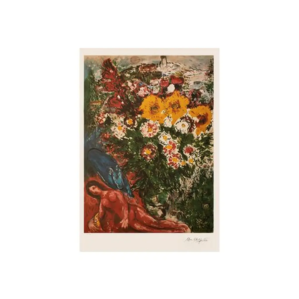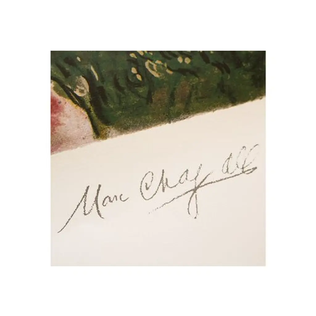 A luxurious Limited Edition extra large reproduction of the lithograph after painting "The Worries" (Les soucis) by Marc Chagall. Facsimile signed, numbered in pencil. Limited Edition of 500 copies. Photomechanical plates used in this edition has been destroyed. Printed in 1999, on high quality thick paper. Publisher copy on back. Very detailed. Colors are rich and vivid. Excellent condition - minor edge wear, never framed. Certificate of Authenticity (COA) is included.
