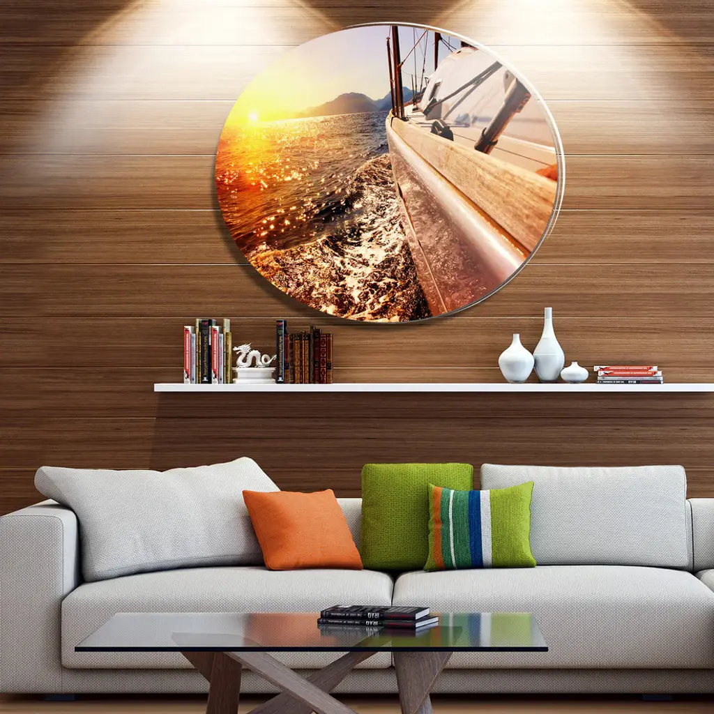 Yacht Sailing Against Sunset, Seashore Round Wall Art, 23"