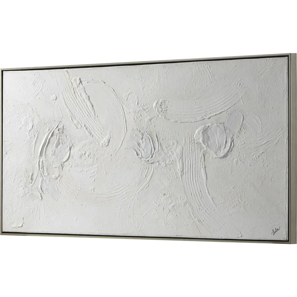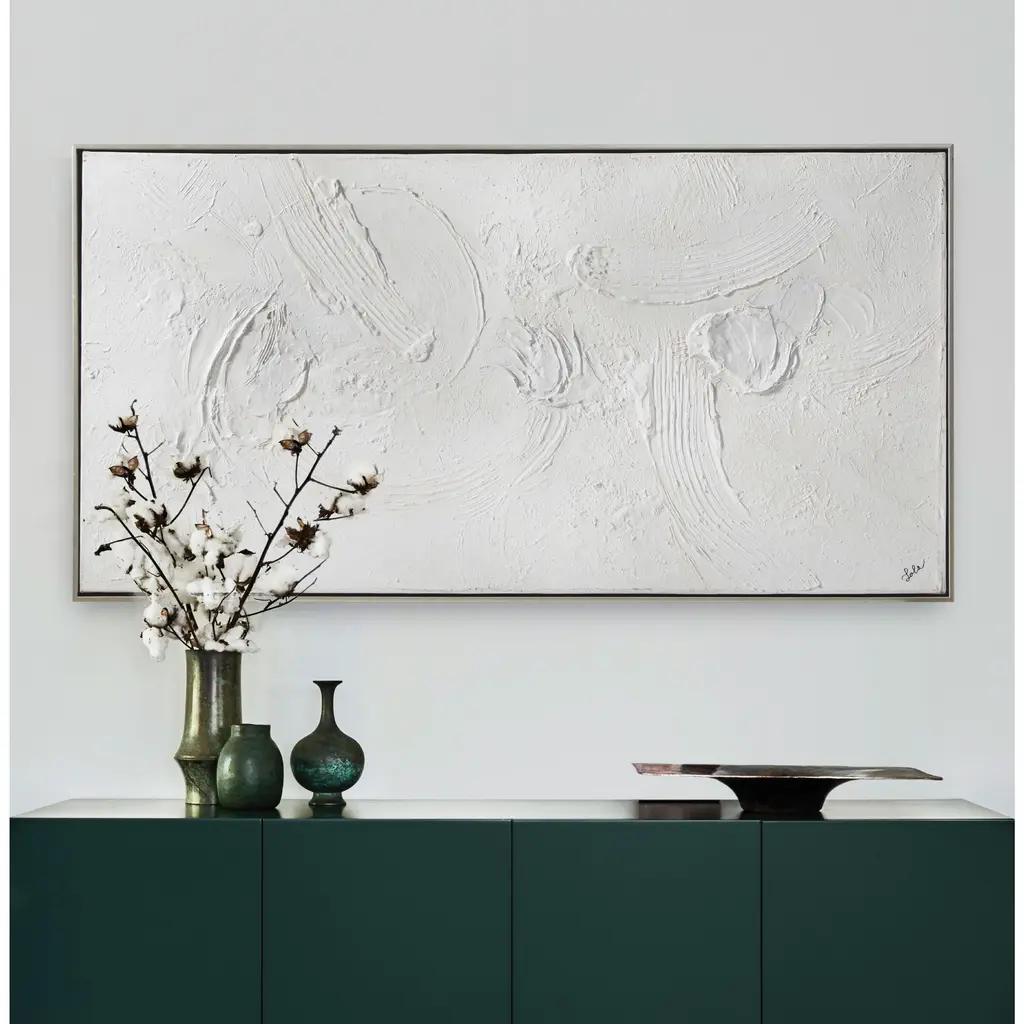 Simple in concept yet striking in design, this all-white painting casts a bold impression within the contemporary interior. With eye-catching textures sweeping across the canvas this piece needs no colour to feel complete.