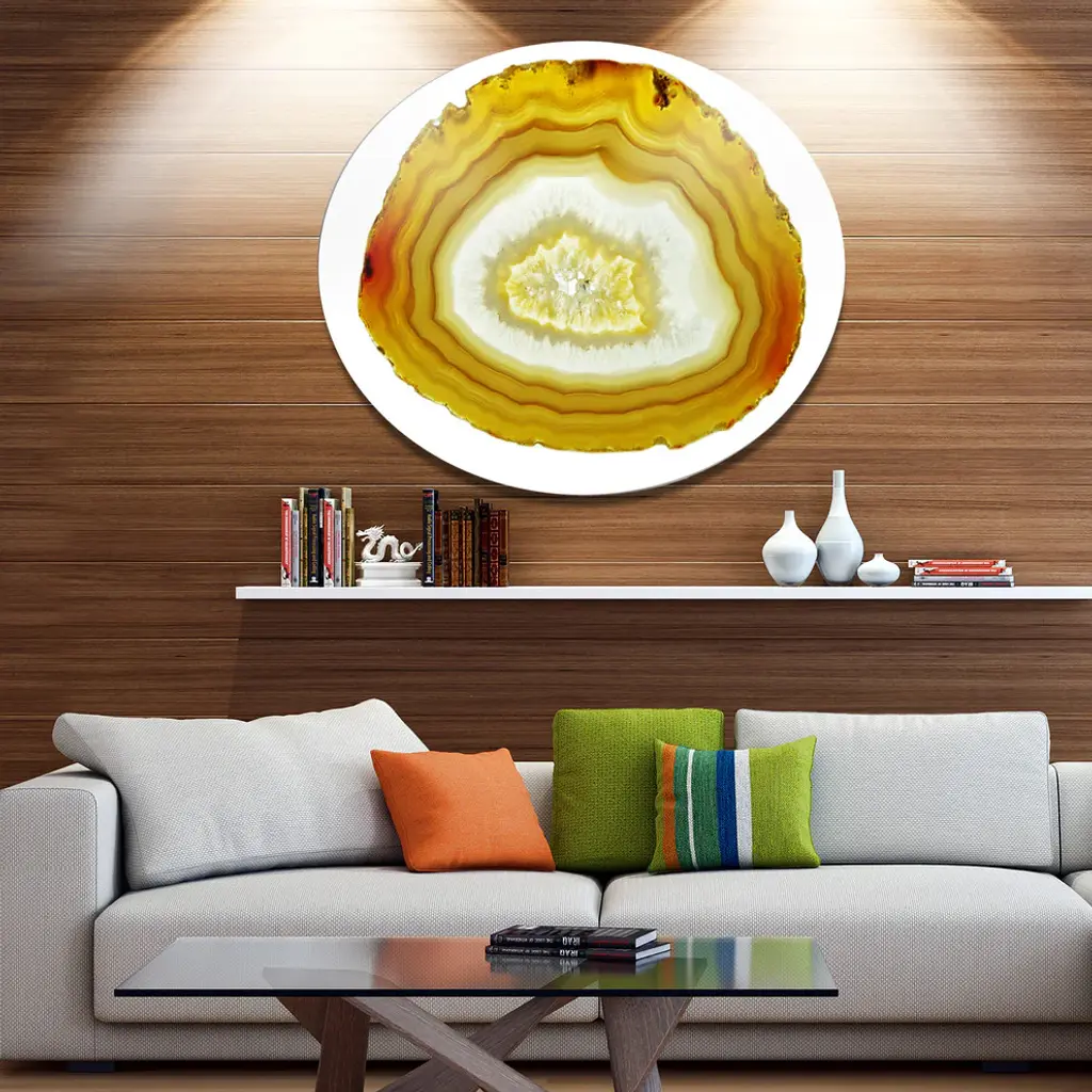 Bring Contemporary Abstraction to your home with this large Circle Metal wall art. This Yellow Agate with Geological Crystal Metal Artwork makes it the focal point of any room or office. - White Gloss Coating ensures colors are extra vibrant with light reflection.- Aluminum grade Sheet Metal with 1 inch mounting frame on the back giving the illusion that the artwork is floating on the wall..- Mounting Brackets are included along with instructions.- High Quality Digital images are created directly into a glossy aluminum panel producing a stunning and captivating print into the glossy finish of the metal.- Water, Fire and Scratch resistant HD Aluminum panels.- Looks better than any photo paper and guaranteed to last at least 20 years- Easy to clean with a microfiber cloth. Colors are far superior to regular Canvas Art. - Easy to Hang
