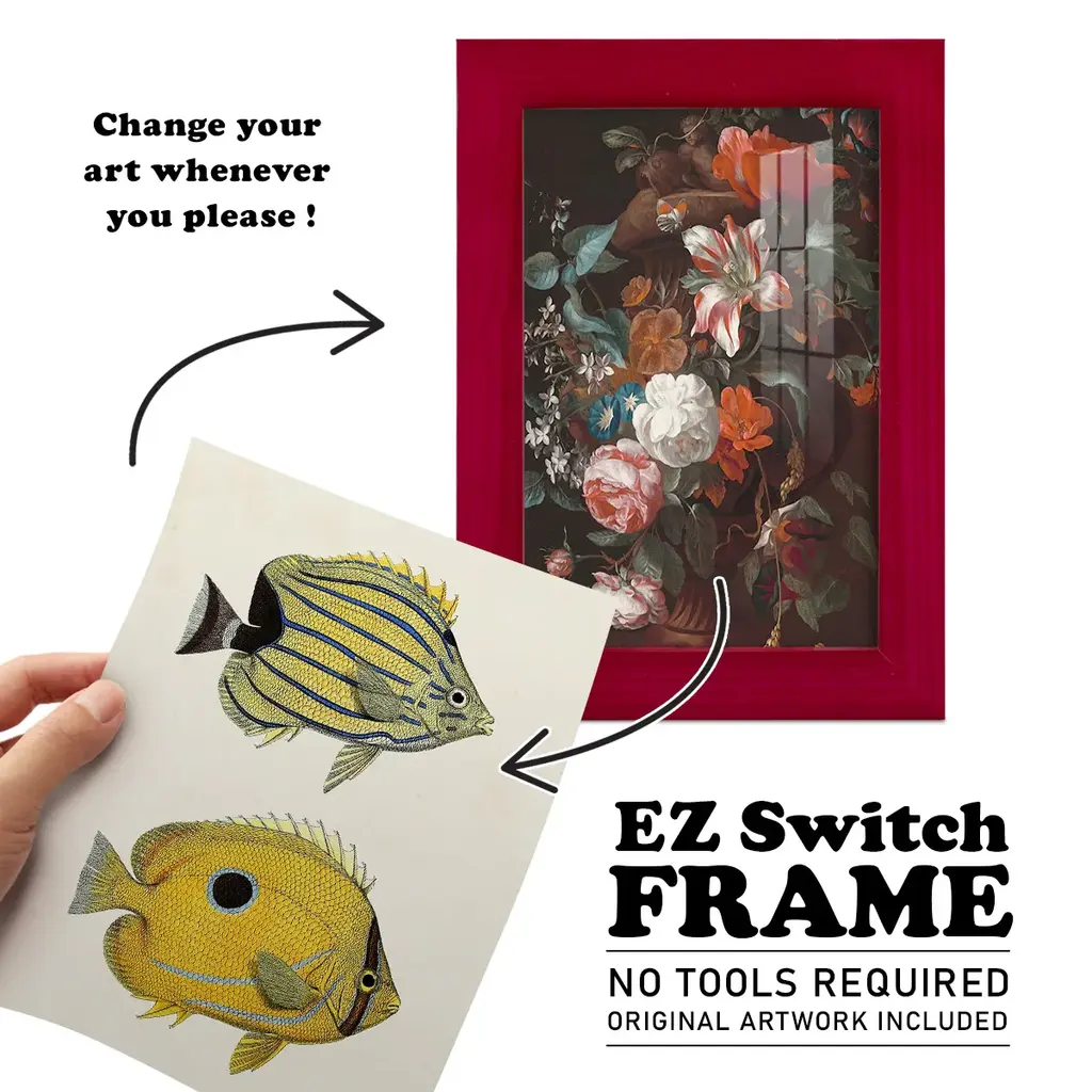 Yellow & Grey Fish III -EZ SWITCH Framed Print w/glass-Cherry Red A delightful, framed print. Featuring a solid wood frame with real wood glass. This premium print is giclee quality. In addition, every frame features a removable back and table top stand. This allows you to change your art in the future or to just stand the art on a table for a new look. We are sure you'll enjoy our new series of EZ SWITCH Framed Art. Solid Wood Frame Real Glass Removable / Replaceable Art Built in Tabletop Stand Sizes range from 4x6 up to 12x15 - buy just one or pair them up as sets as you see fit.