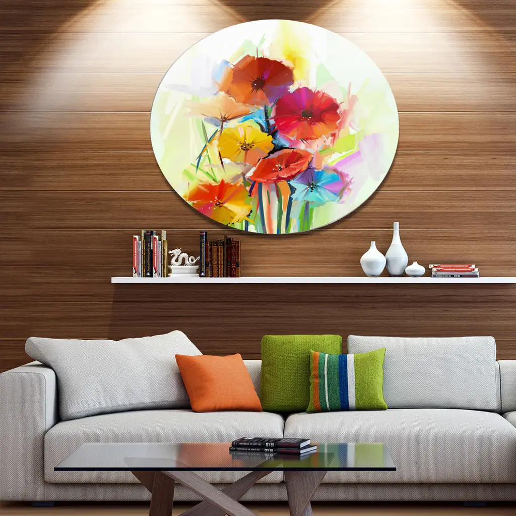 Bring Contemporary Abstraction to your home with this large Circle Metal wall art. This Yellow and Red Gerbera Flowers Metal Artwork makes it the focal point of any room or office. - White Gloss Coating ensures colors are extra vibrant with light reflection.- Aluminum grade Sheet Metal with 1 inch mounting frame on the back giving the illusion that the artwork is floating on the wall..- Mounting Brackets are included along with instructions.- High Quality Digital images are created directly into a glossy aluminum panel producing a stunning and captivating print into the glossy finish of the metal.- Water, Fire and Scratch resistant HD Aluminum panels.- Looks better than any photo paper and guaranteed to last at least 20 years- Easy to clean with a microfiber cloth. Colors are far superior to regular Canvas Art. - Easy to Hang
