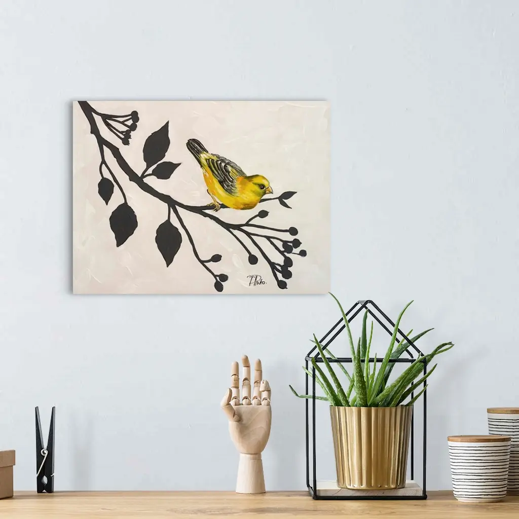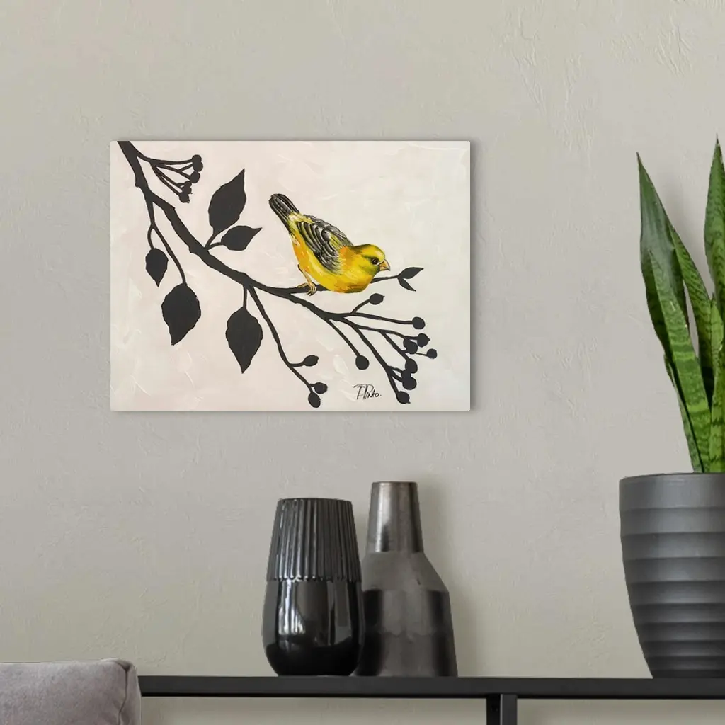 A contemporary painting of a yellow bird perched on a black branch with leaves and berries on a white background.