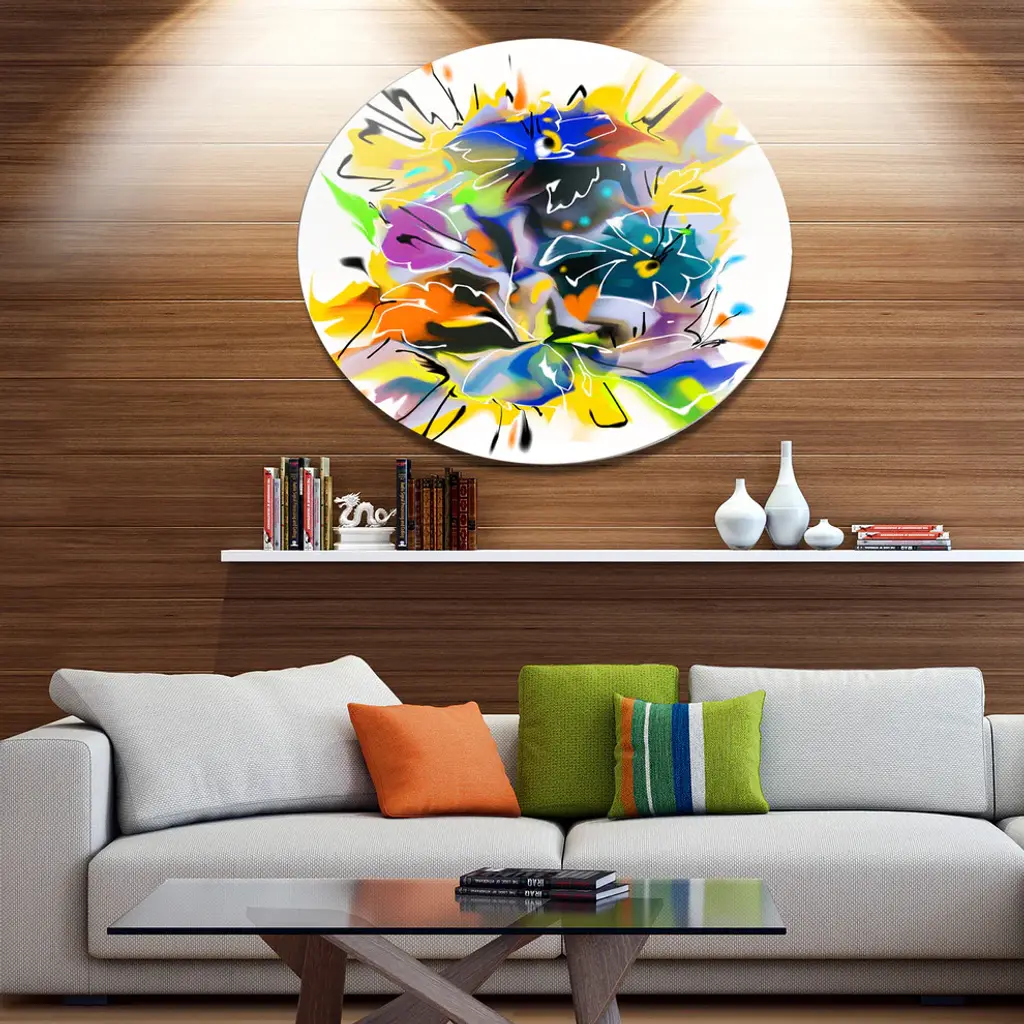 Bring Contemporary Abstraction to your home with this large Circle Metal wall art. This Yellow Blue Abstract Floral Design Metal Artwork makes it the focal point of any room or office. - White Gloss Coating ensures colors are extra vibrant with light reflection.- Aluminum grade Sheet Metal with 1 inch mounting frame on the back giving the illusion that the artwork is floating on the wall..- Mounting Brackets are included along with instructions.- High Quality Digital images are created directly into a glossy aluminum panel producing a stunning and captivating print into the glossy finish of the metal.- Water, Fire and Scratch resistant HD Aluminum panels.- Looks better than any photo paper and guaranteed to last at least 20 years- Easy to clean with a microfiber cloth. Colors are far superior to regular Canvas Art. - Easy to Hang