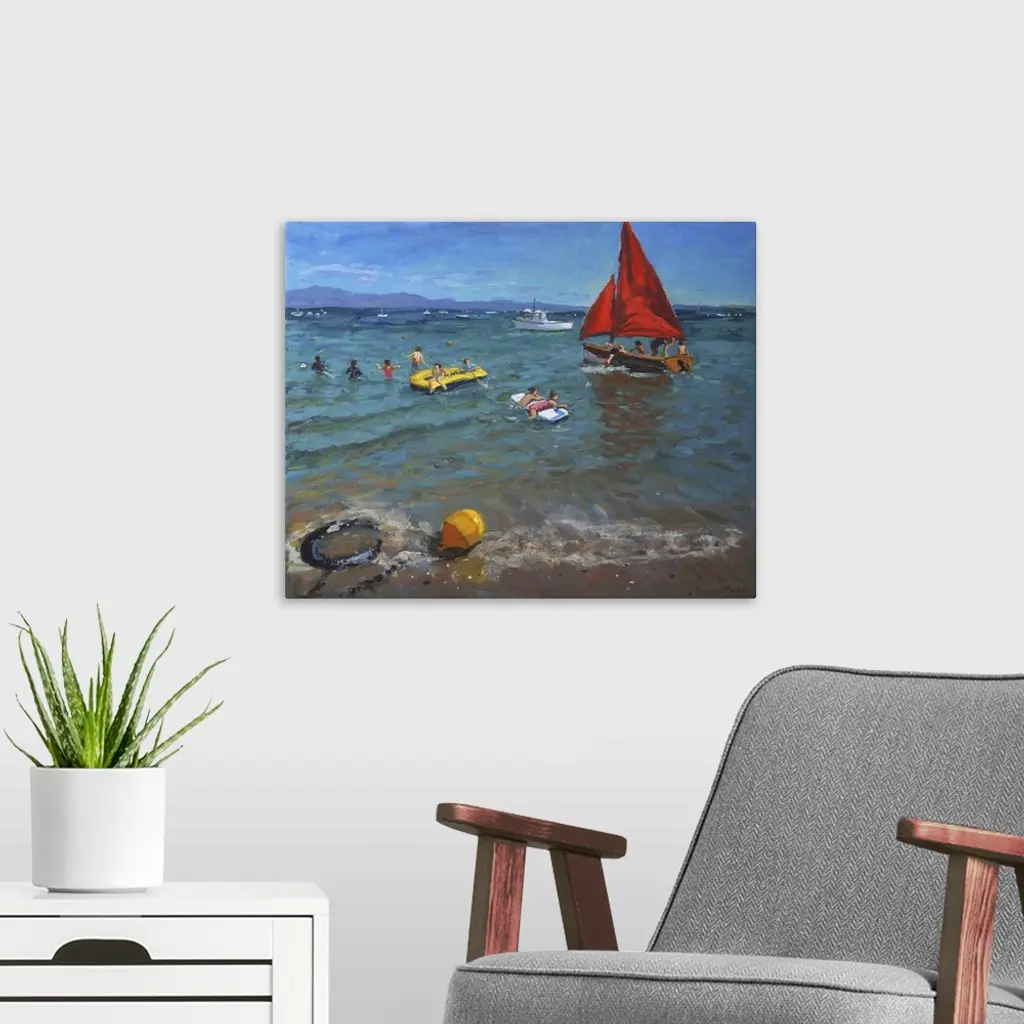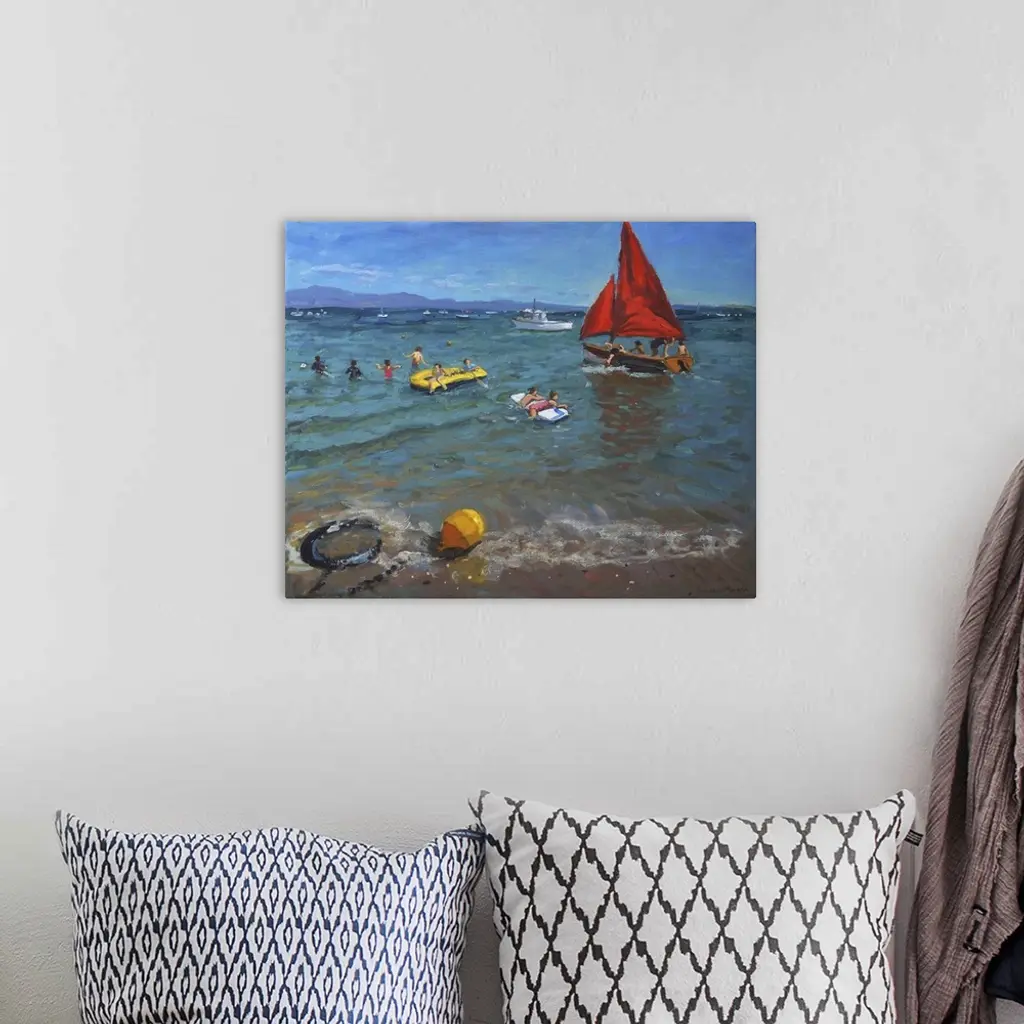 Contemporary painting of a sailboat in the water with people wading nearby.