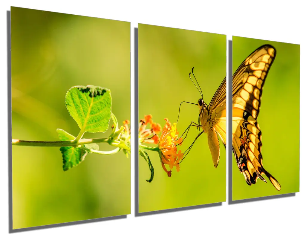48"œ x 24"œ total size. Ready To Hang! (3 pieces - 16"œ x 24"œ each). 3 Panel Split (Triptych) Metal Print featuring a closeup nature photography shot of a yellow butterfly, feeding on a flower. Modern metal wall art for home or office wall decor & interior design. Printed on Luxurious, HD aluminum glossy metal panels. Mult. HD aluminum panels. Metal print wall art. Includes Shadow Wall Mount on the back.• Aluminum Metal Wall Art• Made in USA• Ready to hang - No assembly required• Shadow mount hardware on the back• 0.045"œ thick HD Aluminum Panels• Scratch resistant, glossy finish• Superb color clarity, luxurious prints• Epson printing process• For indoor or moisture rich environment use• Easy to clean. Gently wipe with microfiber cloth.