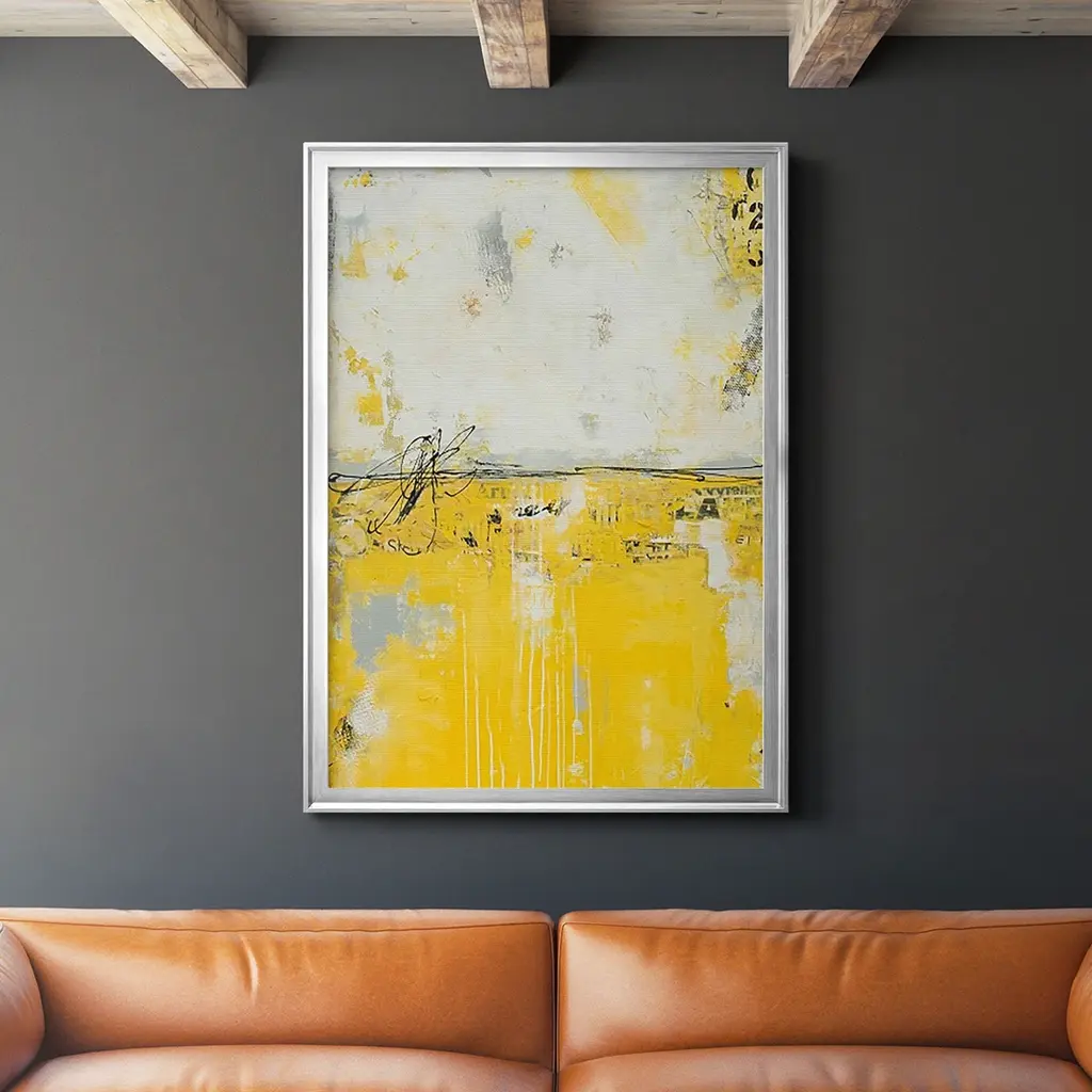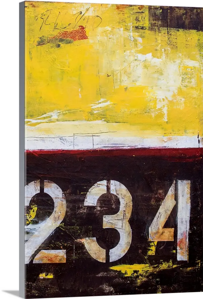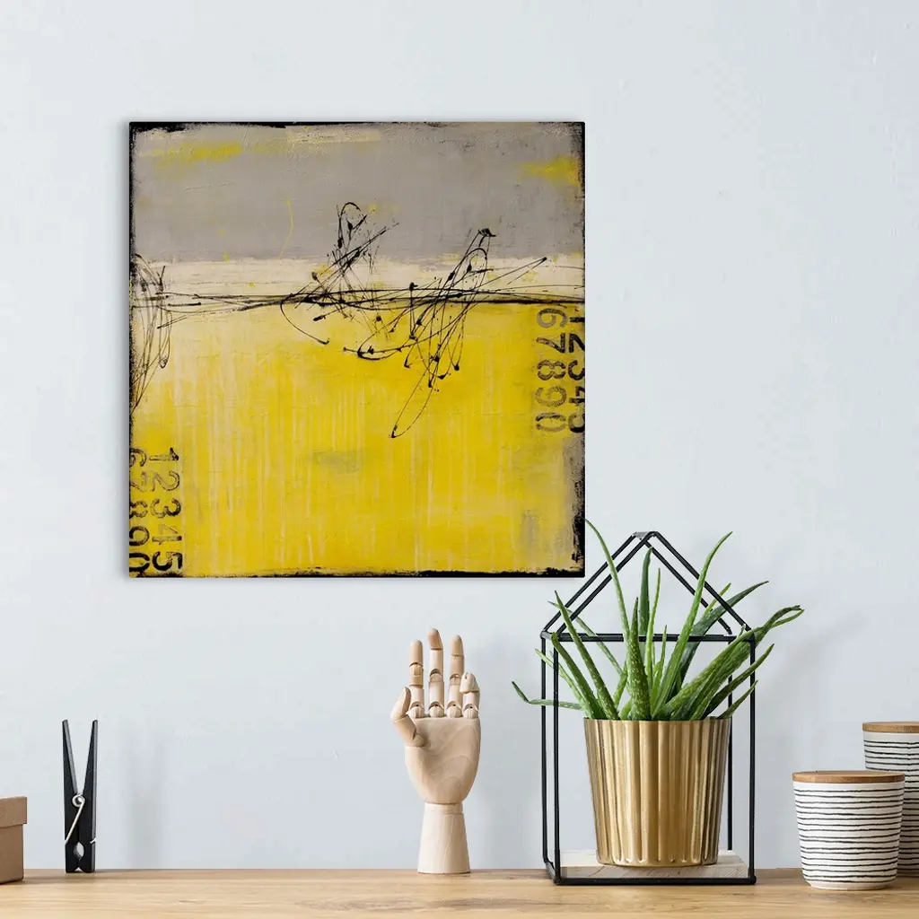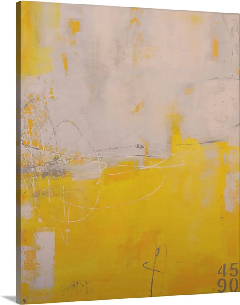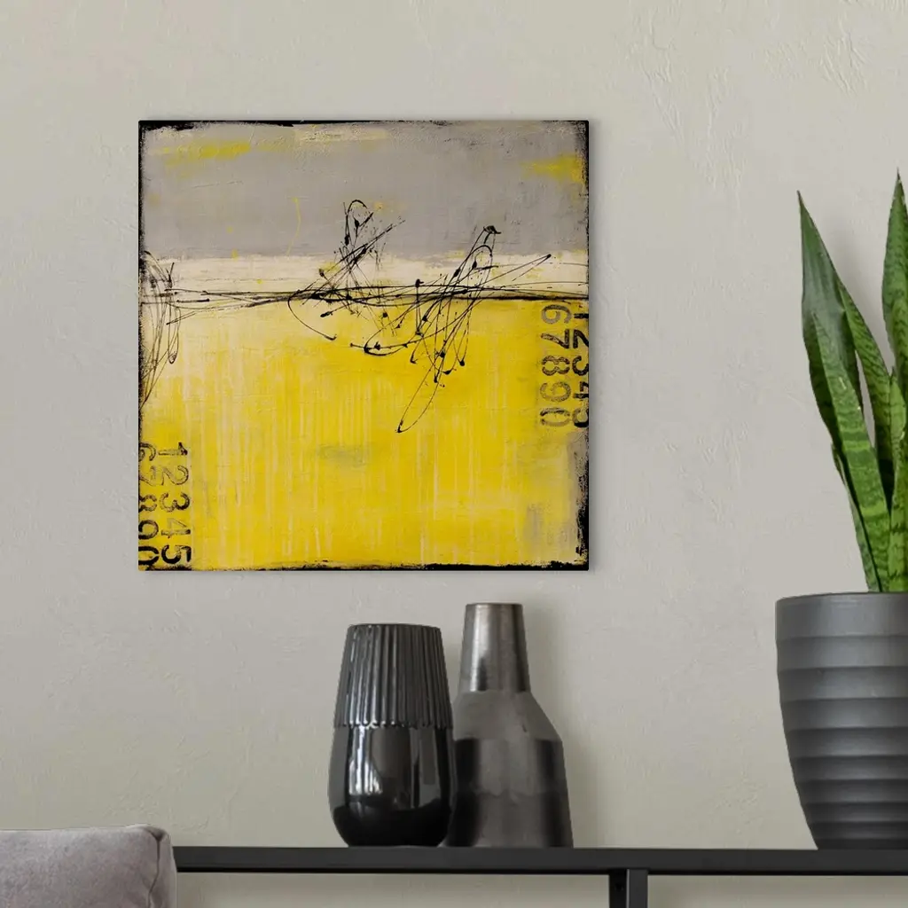 A contemporary abstract painting using gray and yellow with stenciled numbers and thin dark black swirling lines.
