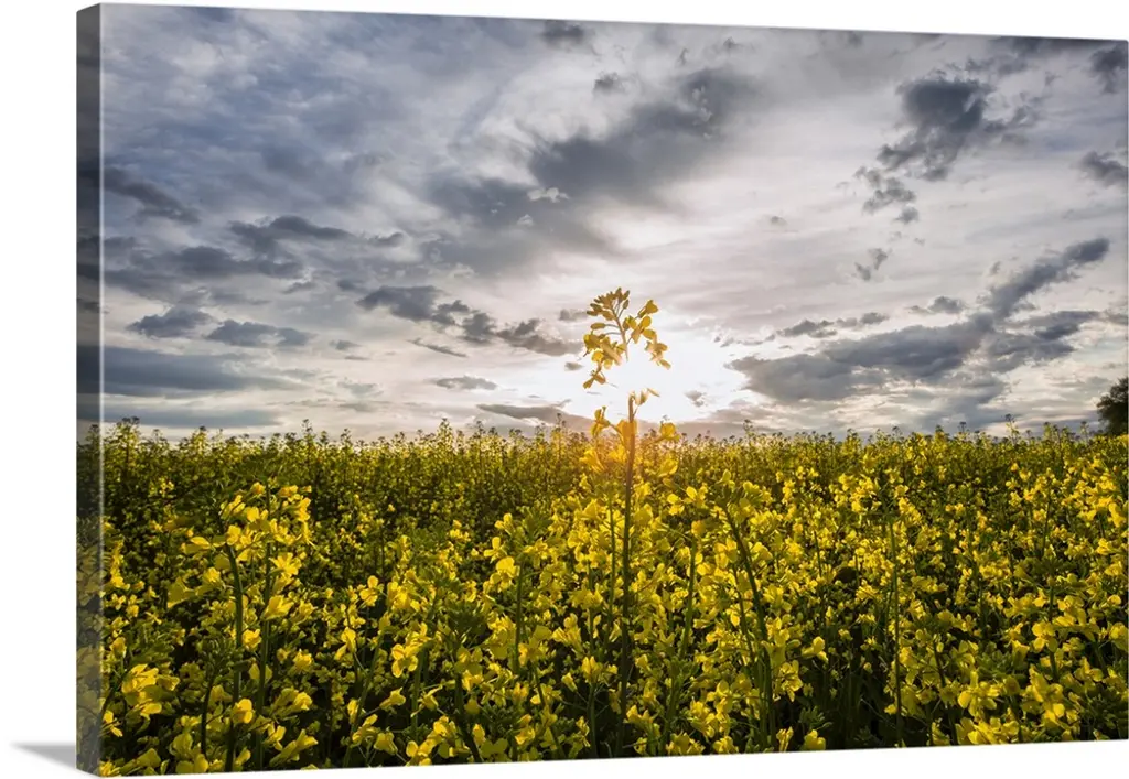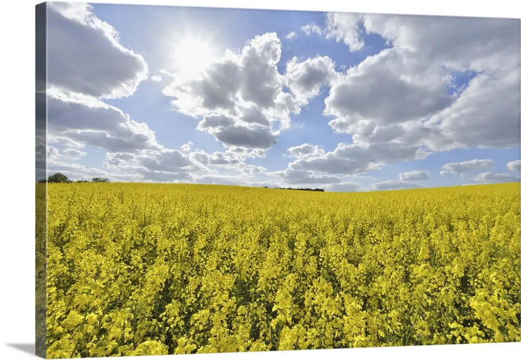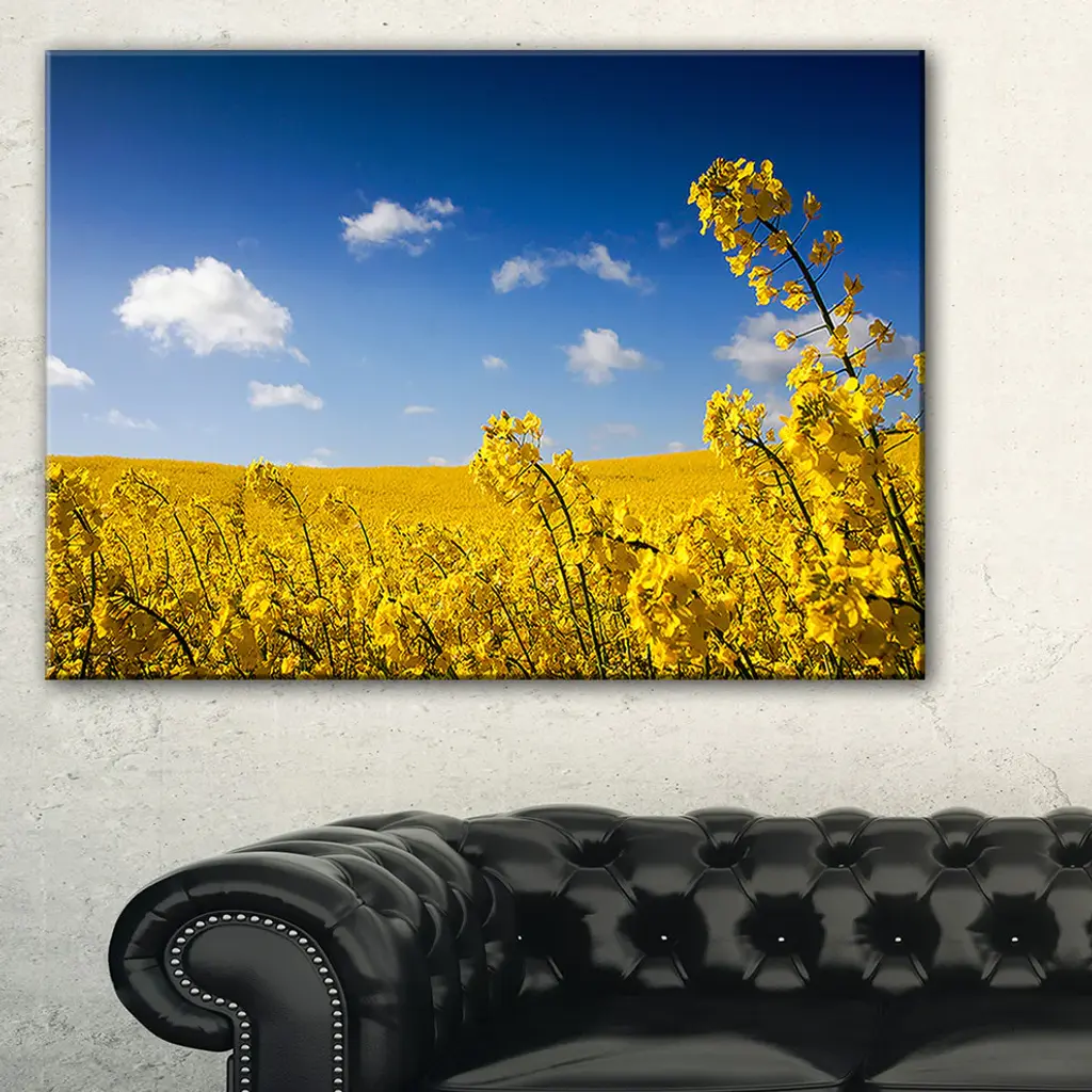 The Yellow Canola Field canvas art print is sure to make an impression on anyone who sees it. This artwork is gallery wrapped around a 1-inch solid wood frame and arrives carefully packaged and entirely ready to hang on the wall. Design Art only uses the highest resolution and pigments to ensure a crisp colorful print that is never faded or pixelated. This artwork is sure to be a conversation starter in any home or office.