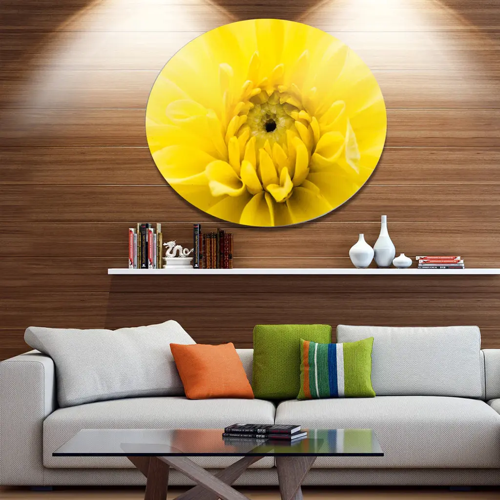 Bring Contemporary Abstraction to your home with this large Circle Metal wall art. This Yellow Chrysanthemum Gold Flower Metal Artwork makes it the focal point of any room or office. - White Gloss Coating ensures colors are extra vibrant with light reflection.- Aluminum grade Sheet Metal with 1 inch mounting frame on the back giving the illusion that the artwork is floating on the wall..- Mounting Brackets are included along with instructions.- High Quality Digital images are created directly into a glossy aluminum panel producing a stunning and captivating print into the glossy finish of the metal.- Water, Fire and Scratch resistant HD Aluminum panels.- Looks better than any photo paper and guaranteed to last at least 20 years- Easy to clean with a microfiber cloth. Colors are far superior to regular Canvas Art. - Easy to Hang