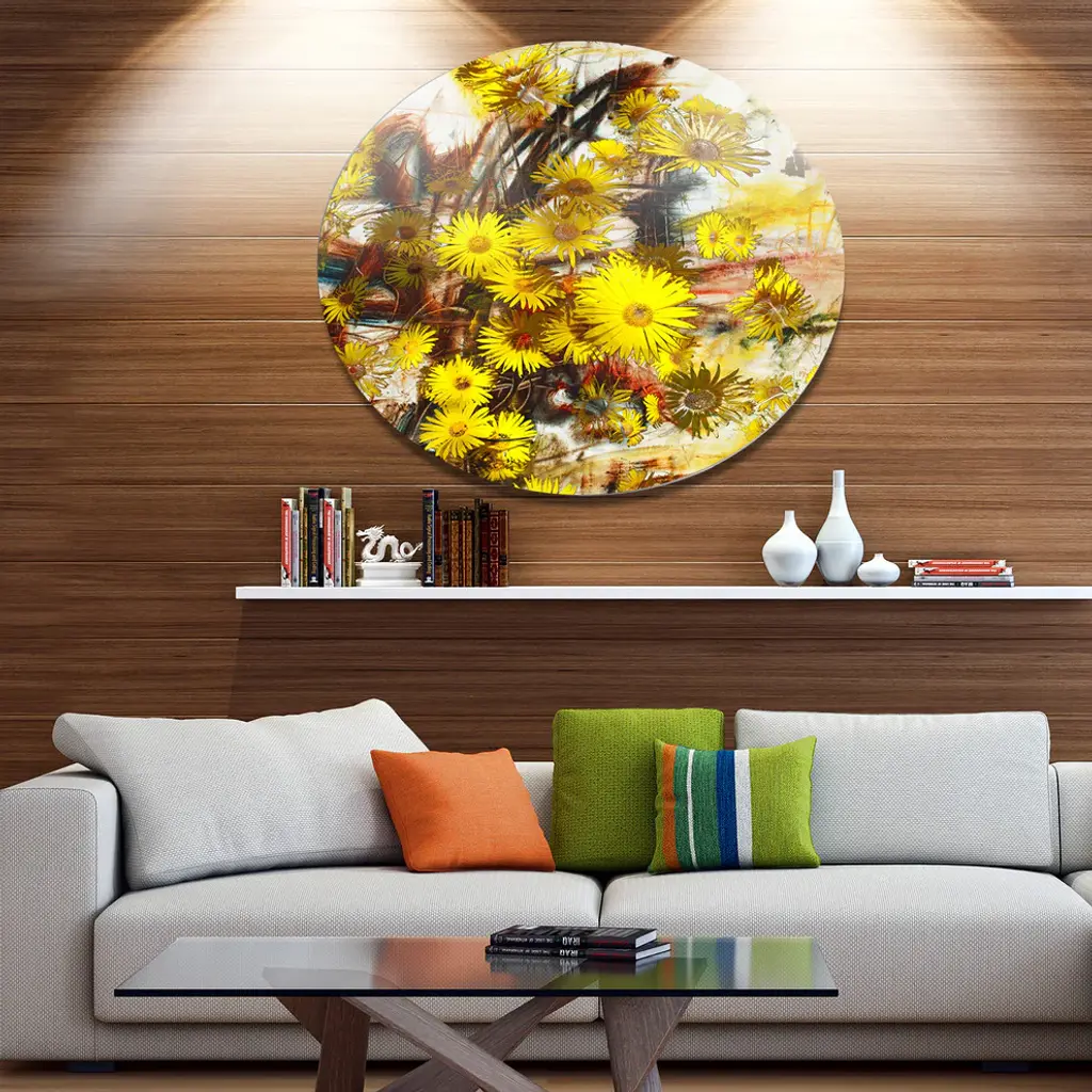 Bring Contemporary Abstraction to your home with this large Circle Metal wall art. This Yellow Flowers Watercolor Illustration Metal Artwork makes it the focal point of any room or office. - White Gloss Coating ensures colors are extra vibrant with light reflection.- Aluminum grade Sheet Metal with 1 inch mounting frame on the back giving the illusion that the artwork is floating on the wall..- Mounting Brackets are included along with instructions.- High Quality Digital images are created directly into a glossy aluminum panel producing a stunning and captivating print into the glossy finish of the metal.- Water, Fire and Scratch resistant HD Aluminum panels.- Looks better than any photo paper and guaranteed to last at least 20 years- Easy to clean with a microfiber cloth. Colors are far superior to regular Canvas Art. - Easy to Hang