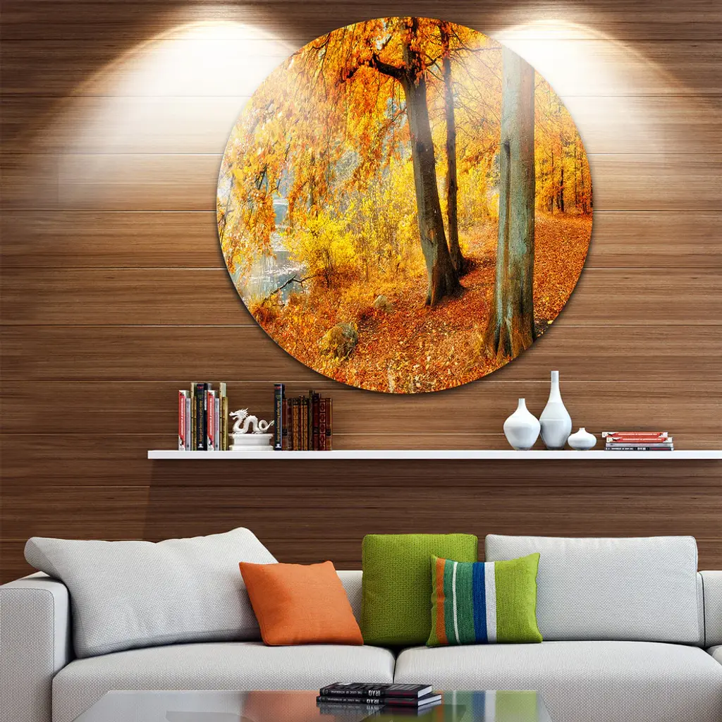Bring Contemporary Abstraction to your home with this large Circle Metal wall art. This Yellow Forest of Autumn Metal Artwork makes it the focal point of any room or office. - White Gloss Coating ensures colors are extra vibrant with light reflection.- Aluminum grade Sheet Metal with 1 inch mounting frame on the back giving the illusion that the artwork is floating on the wall..- Mounting Brackets are included along with instructions.- High Quality Digital images are created directly into a glossy aluminum panel producing a stunning and captivating print into the glossy finish of the metal.- Water, Fire and Scratch resistant HD Aluminum panels.- Looks better than any photo paper and guaranteed to last at least 20 years- Easy to clean with a microfiber cloth. Colors are far superior to regular Canvas Art. - Easy to Hang