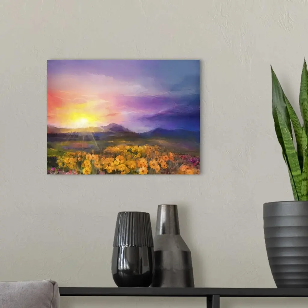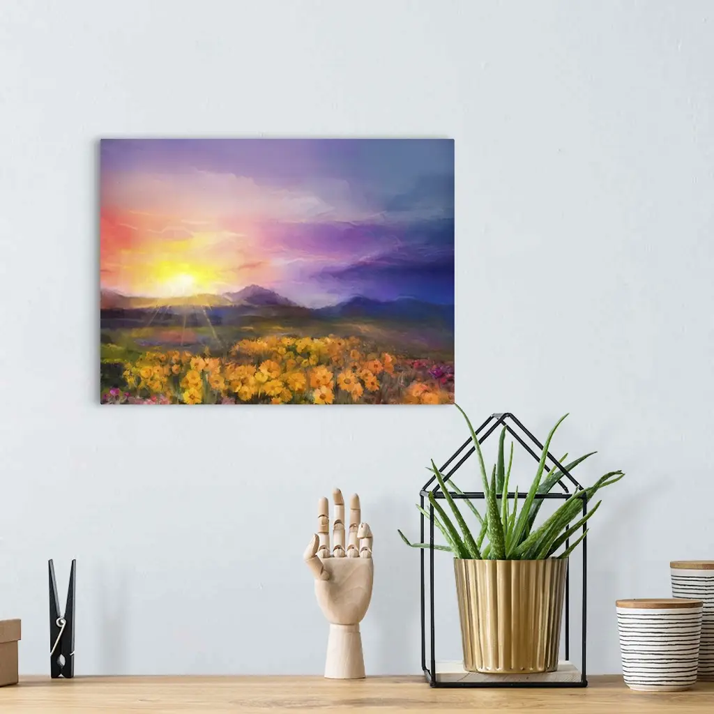 Originally an oil painting yellow- golden daisy flowers in fields. Sunset meadow landscape with wildflower, hill and sky in orange and blue violet color background. Originally a hand painted summer floral in an impressionist style.