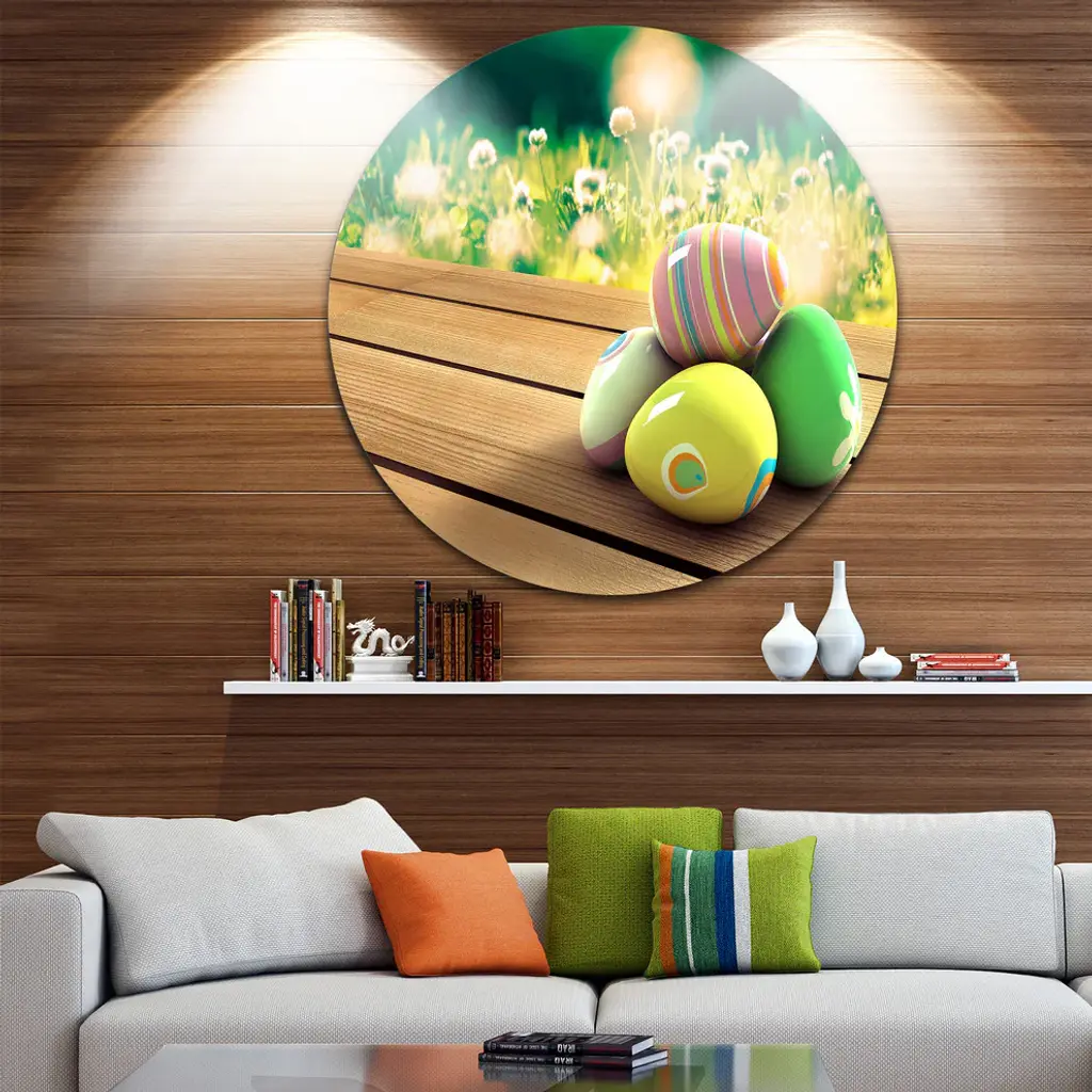 Bring Contemporary Abstraction to your home with this large Circle Metal wall art. This Yellow Green Easter Eggs Metal Artwork makes it the focal point of any room or office. - White Gloss Coating ensures colors are extra vibrant with light reflection.- Aluminum grade Sheet Metal with 1 inch mounting frame on the back giving the illusion that the artwork is floating on the wall..- Mounting Brackets are included along with instructions.- High Quality Digital images are created directly into a glossy aluminum panel producing a stunning and captivating print into the glossy finish of the metal.- Water, Fire and Scratch resistant HD Aluminum panels.- Looks better than any photo paper and guaranteed to last at least 20 years- Easy to clean with a microfiber cloth. Colors are far superior to regular Canvas Art. - Easy to Hang