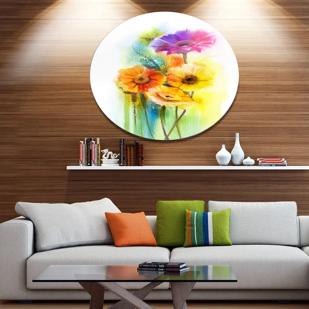 Bring Contemporary Abstraction to your home with this large Circle Metal wall art. This Yellow Orange Purple Gerbera Flowers Metal Artwork makes it the focal point of any room or office. - White Gloss Coating ensures colors are extra vibrant with light reflection.- Aluminum grade Sheet Metal with 1 inch mounting frame on the back giving the illusion that the artwork is floating on the wall..- Mounting Brackets are included along with instructions.- High Quality Digital images are created directly into a glossy aluminum panel producing a stunning and captivating print into the glossy finish of the metal.- Water, Fire and Scratch resistant HD Aluminum panels.- Looks better than any photo paper and guaranteed to last at least 20 years- Easy to clean with a microfiber cloth. Colors are far superior to regular Canvas Art. - Easy to Hang