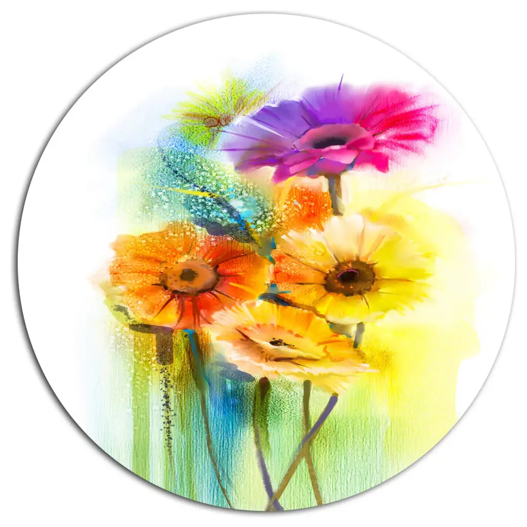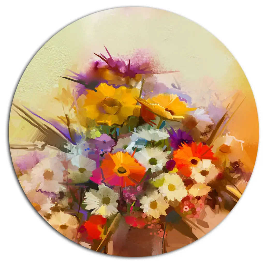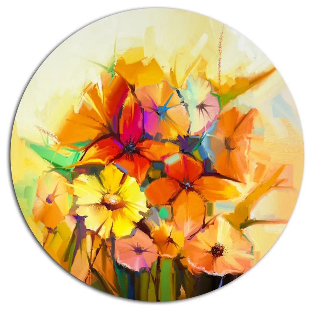 Bring Contemporary Abstraction to your home with this large Circle Metal wall art. This Yellow Pink Gerbera and Rose Bouquet Metal Artwork makes it the focal point of any room or office. - White Gloss Coating ensures colors are extra vibrant with light reflection.- Aluminum grade Sheet Metal with 1 inch mounting frame on the back giving the illusion that the artwork is floating on the wall..- Mounting Brackets are included along with instructions.- High Quality Digital images are created directly into a glossy aluminum panel producing a stunning and captivating print into the glossy finish of the metal.- Water, Fire and Scratch resistant HD Aluminum panels.- Looks better than any photo paper and guaranteed to last at least 20 years- Easy to clean with a microfiber cloth. Colors are far superior to regular Canvas Art. - Easy to Hang