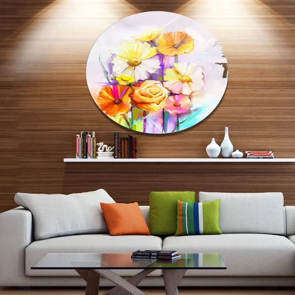 Bring Contemporary Abstraction to your home with this large Circle Metal wall art. This Yellow Pink Gerbera and Rose Bouquet Metal Artwork makes it the focal point of any room or office. - White Gloss Coating ensures colors are extra vibrant with light reflection.- Aluminum grade Sheet Metal with 1 inch mounting frame on the back giving the illusion that the artwork is floating on the wall..- Mounting Brackets are included along with instructions.- High Quality Digital images are created directly into a glossy aluminum panel producing a stunning and captivating print into the glossy finish of the metal.- Water, Fire and Scratch resistant HD Aluminum panels.- Looks better than any photo paper and guaranteed to last at least 20 years- Easy to clean with a microfiber cloth. Colors are far superior to regular Canvas Art. - Easy to Hang