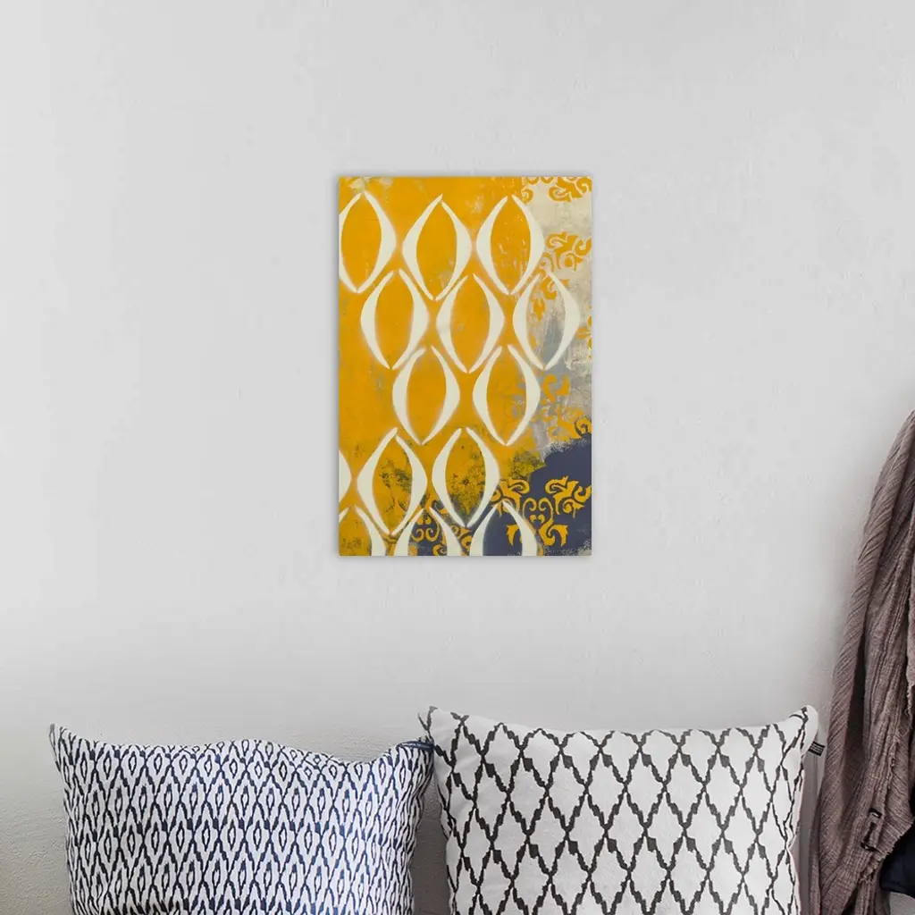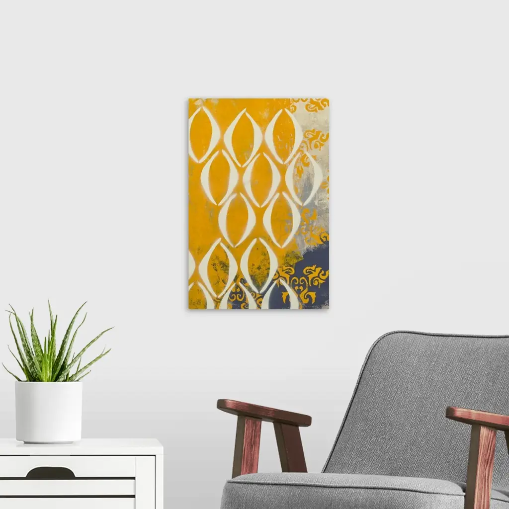 Contemporary abstract painting created with grey and mustard yellow hues and repeating shapes.