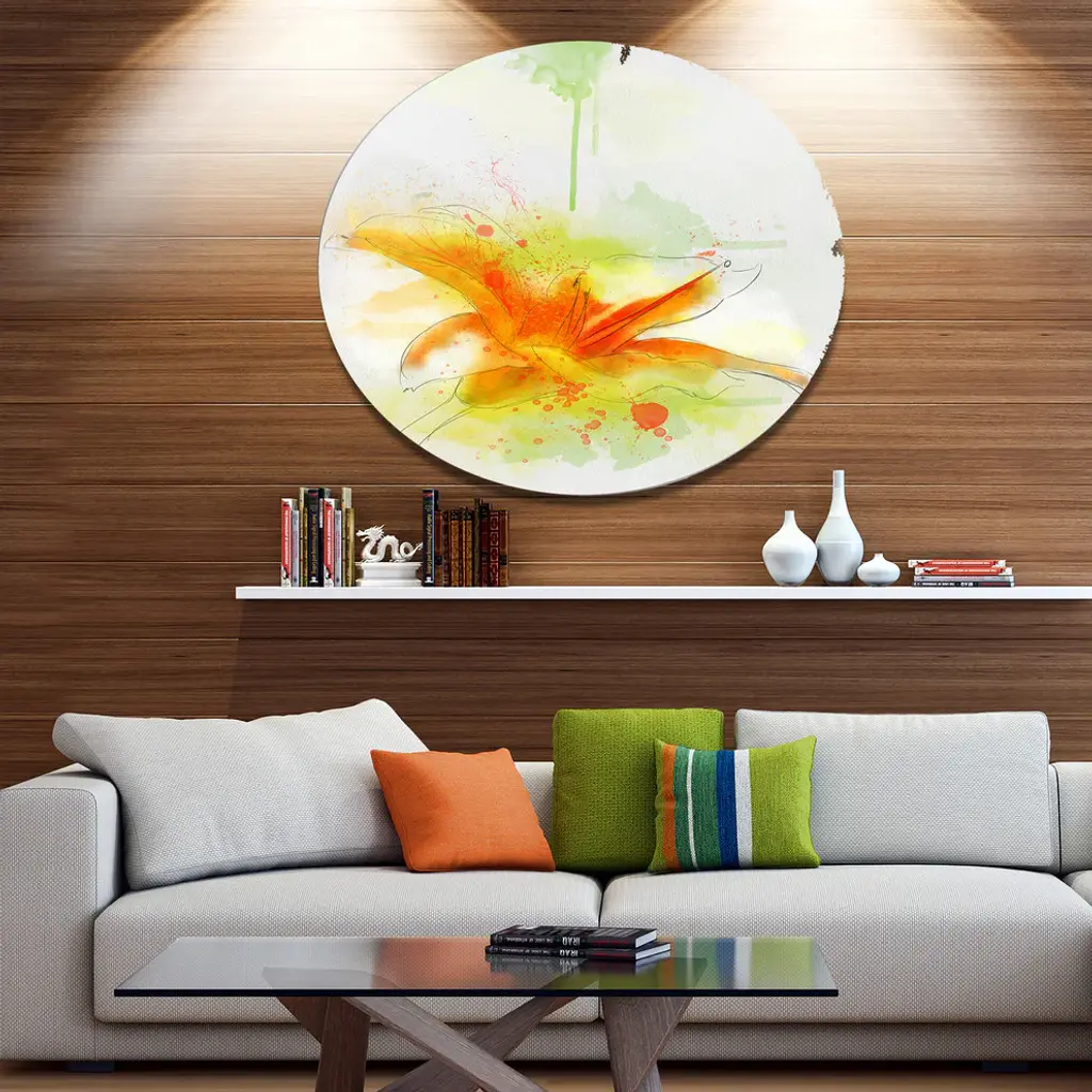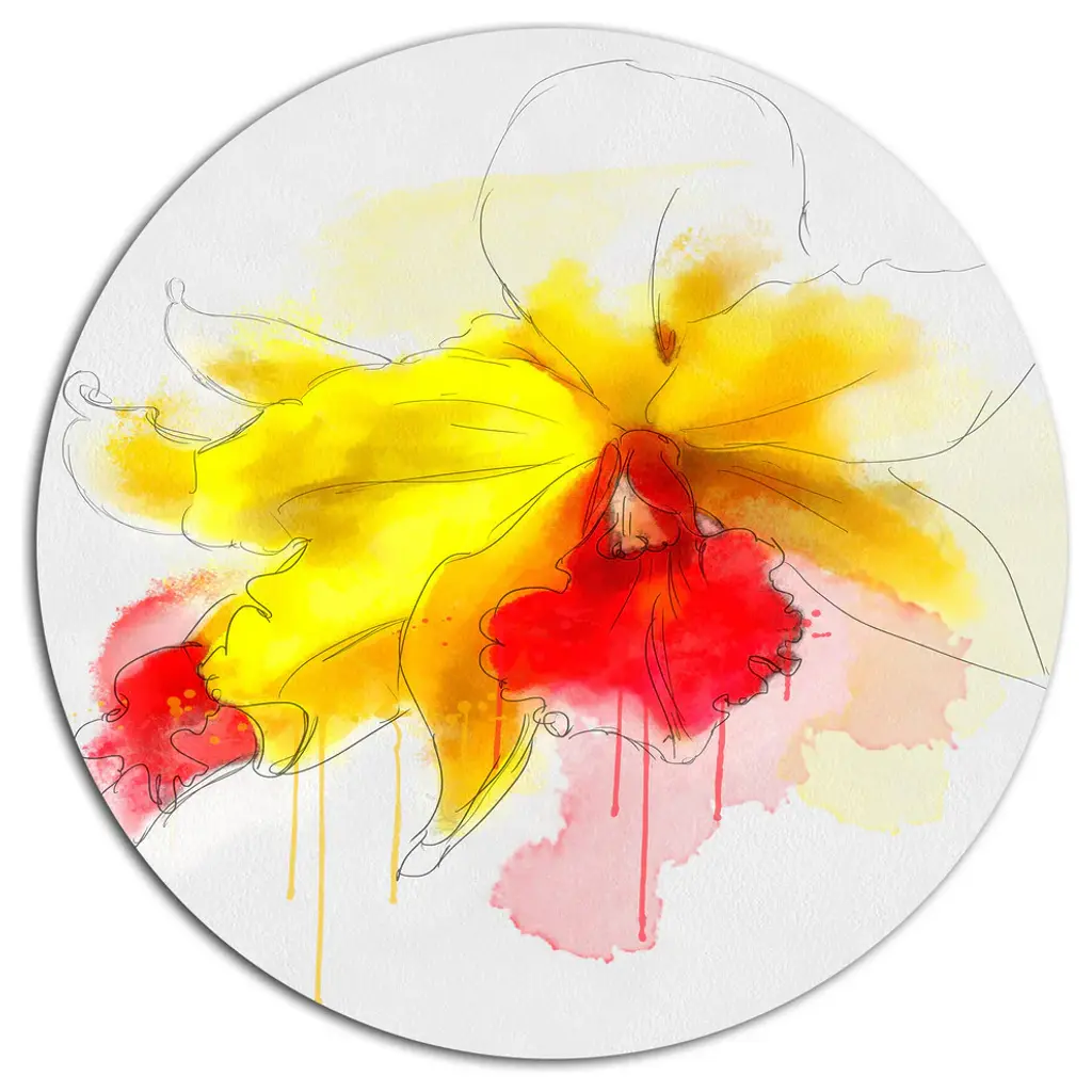 Bring Contemporary Abstraction to your home with this large Circle Metal wall art. This Yellow Red Flower with Color Splashes Metal Artwork makes it the focal point of any room or office. - White Gloss Coating ensures colors are extra vibrant with light reflection.- Aluminum grade Sheet Metal with 1 inch mounting frame on the back giving the illusion that the artwork is floating on the wall..- Mounting Brackets are included along with instructions.- High Quality Digital images are created directly into a glossy aluminum panel producing a stunning and captivating print into the glossy finish of the metal.- Water, Fire and Scratch resistant HD Aluminum panels.- Looks better than any photo paper and guaranteed to last at least 20 years- Easy to clean with a microfiber cloth. Colors are far superior to regular Canvas Art. - Easy to Hang