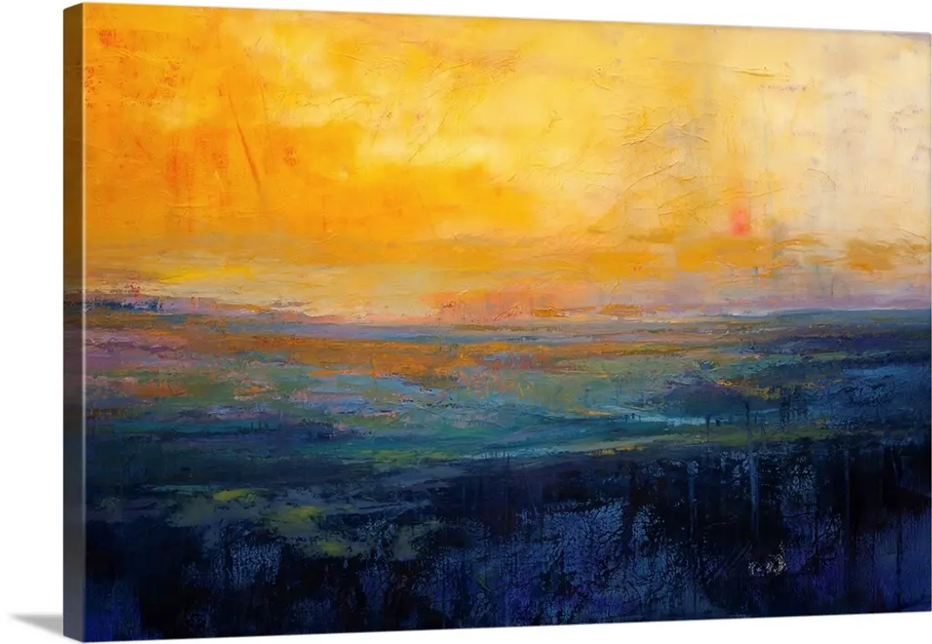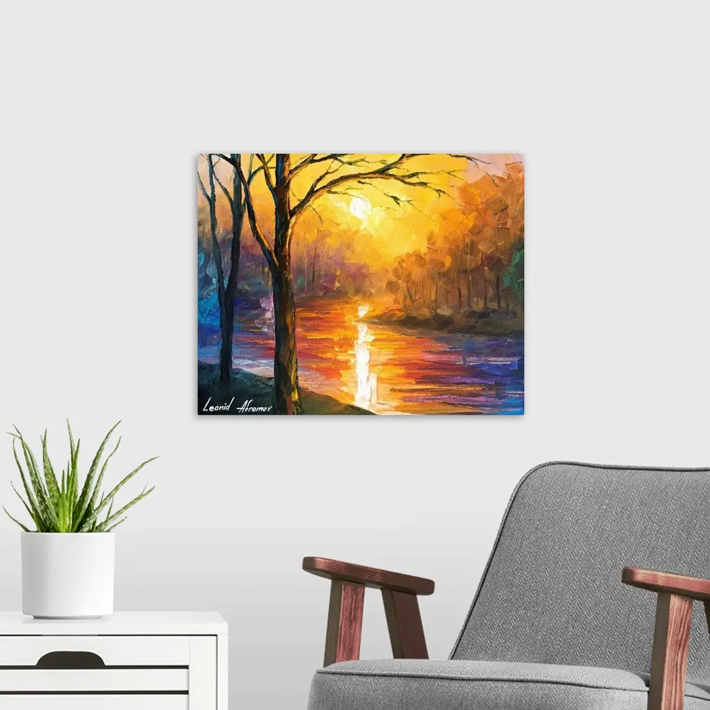 Contemporary colorful painting of the sun setting over a foggy forested river clearing.
