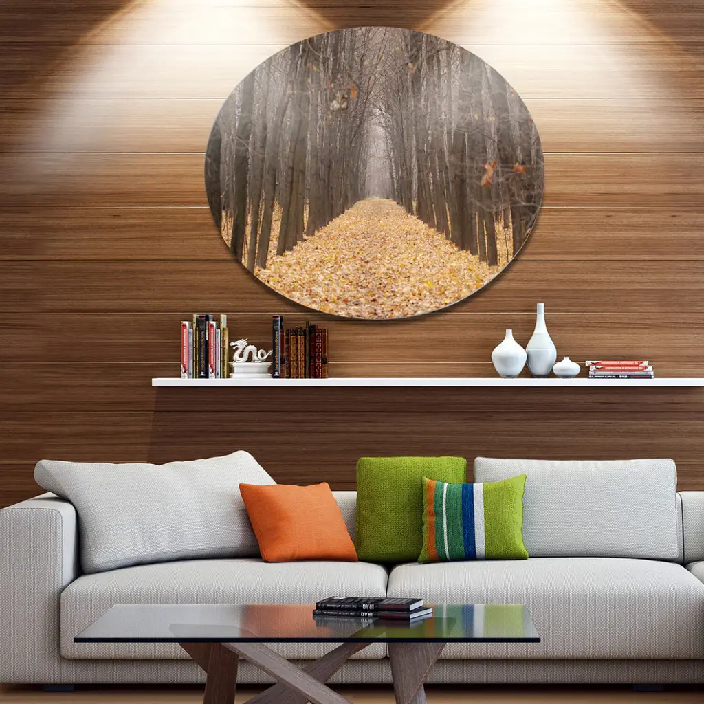 Yellow Road Through Fall Forest, Forest Round Metal Wall Art, 23"