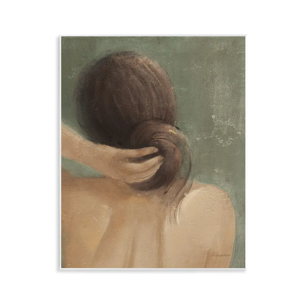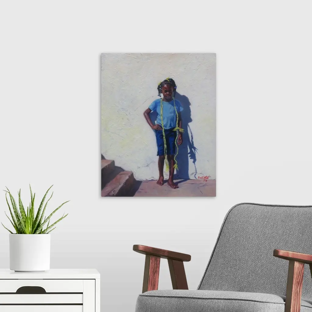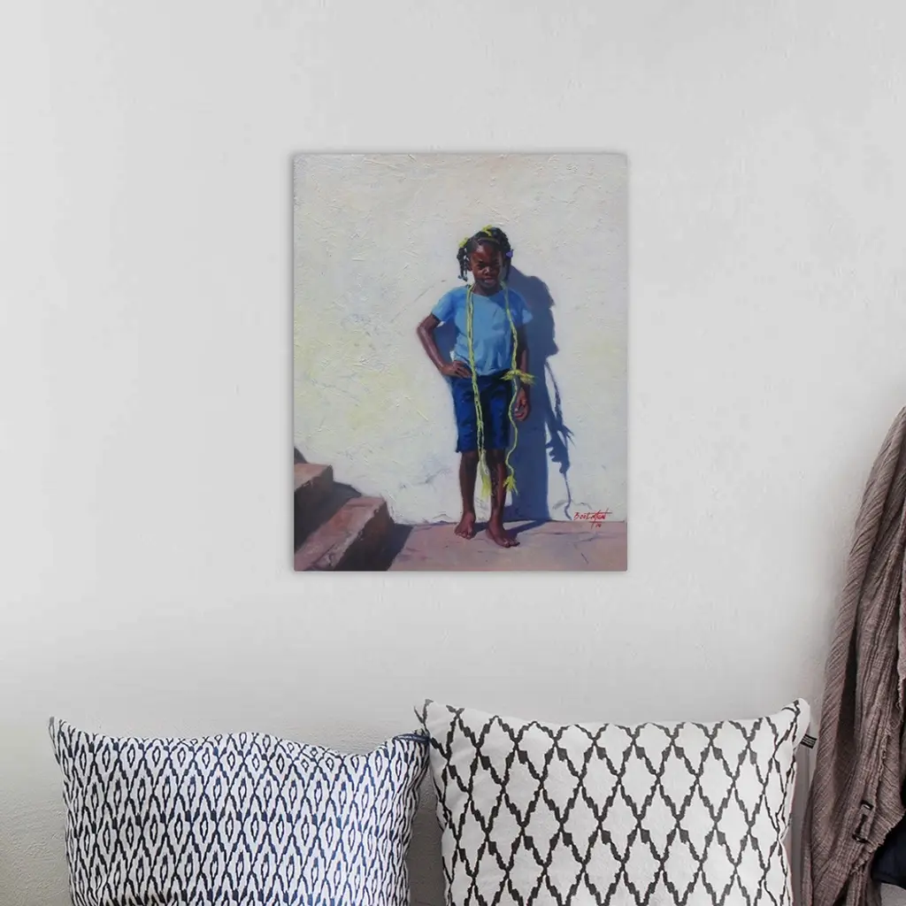 Contemporary painting of a girl with a yellow rope around her shoulders standing against a wall.
