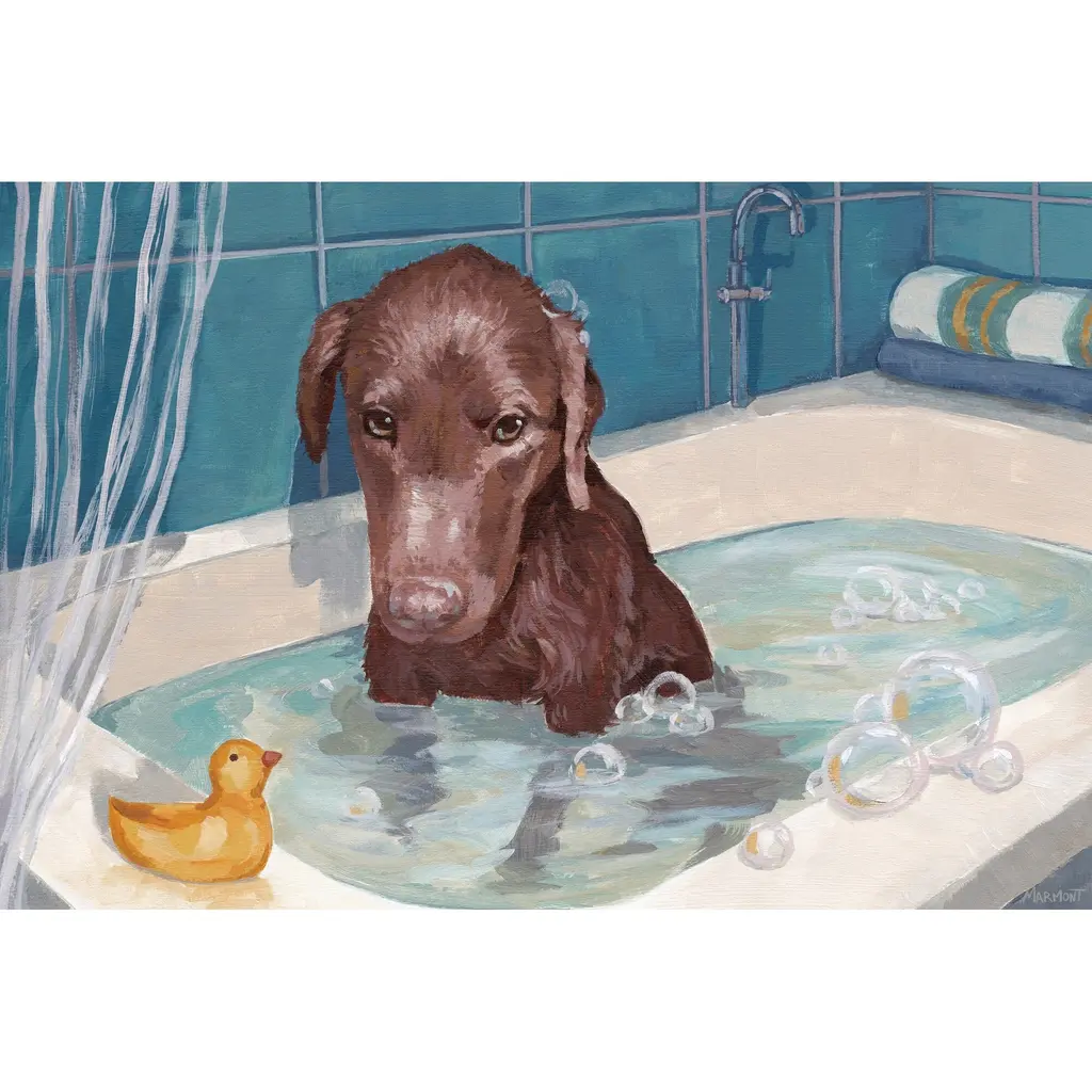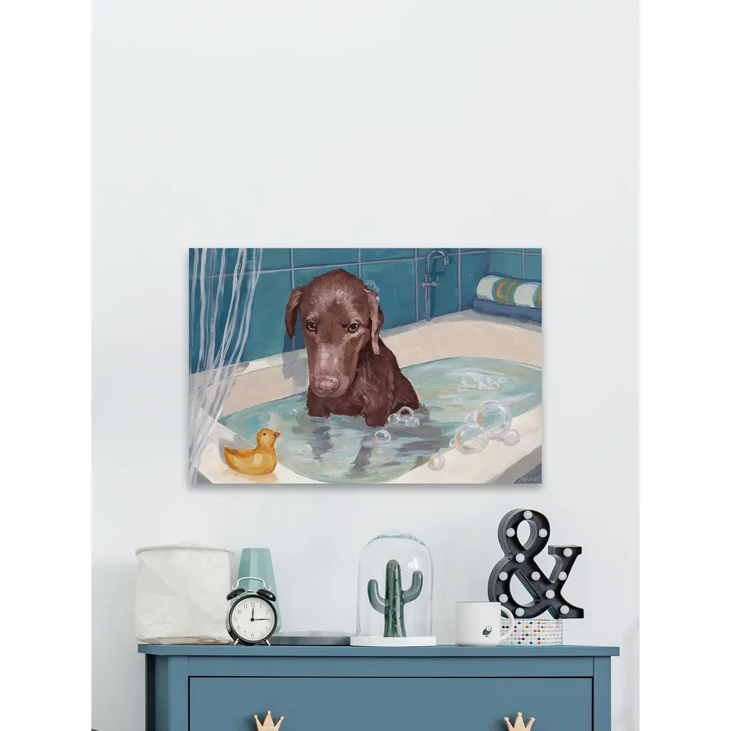 This long-nosed brown pup looks at you with sweet soulful eyes. He sits in the calm bath water with his rubber ducky at his side. The blue tones are calming, and this would look great in any bathroom. Proudly made in the USA, this piece is printed on canvas before it's stretched over non-warping wooden bars for a gallery-wrapped look. With wall-mounting hooks included, this artful accent is ready to hang up as soon as it reaches your front door. • Fine art canvas print from the Marmont Hill Art Collective • Professionally hand stretched • Gallery wrapped in sustainable, non-warping wood • Arrives ready to hang • Made in the USA • Includes a certificate of authenticity