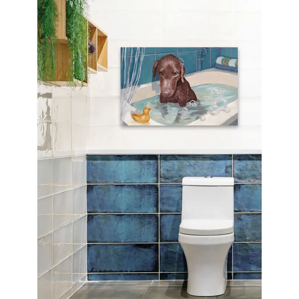 This long-nosed brown pup looks at you with sweet soulful eyes. He sits in the calm bath water with his rubber ducky at his side. The blue tones are calming, and this would look great in any bathroom. Proudly made in the USA, this piece is printed on canvas before it's stretched over non-warping wooden bars for a gallery-wrapped look. With wall-mounting hooks included, this artful accent is ready to hang up as soon as it reaches your front door. • Fine art canvas print from the Marmont Hill Art Collective • Professionally hand stretched • Gallery wrapped in sustainable, non-warping wood • Arrives ready to hang • Made in the USA • Includes a certificate of authenticity