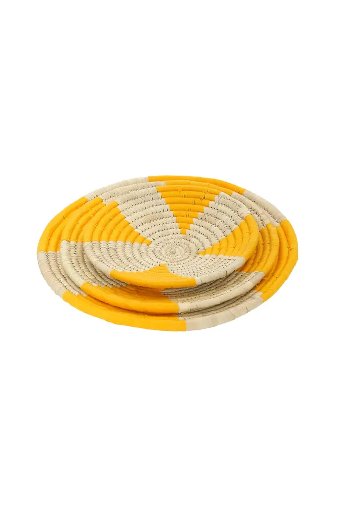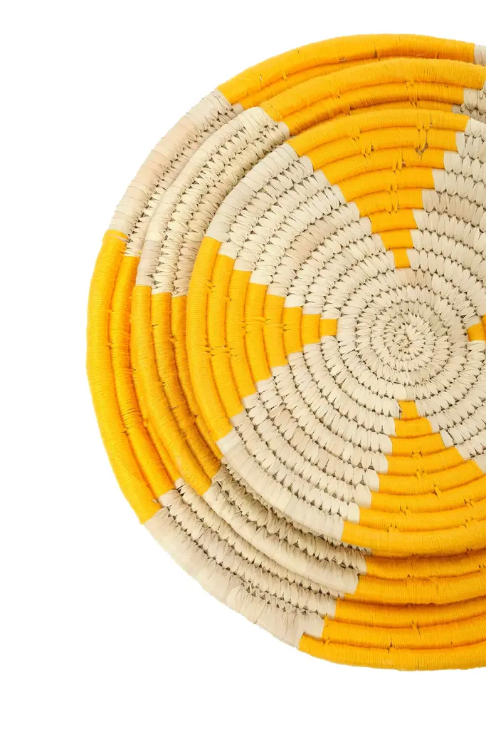Add a pop of color into your space with our handmade woven wall basket. Whether used as wall decor or a functional basket, the yellow and neutral tones and chic design make it easy to incorporate into any room. Let it stand alone or mix and match with additional baskets in different sizes and colors for a curated look. Crafted by artisans in India from natural and sustainable Sabai grass, this basket embodies eco-friendly living, and reflects the beauty of traditional craftsmanship.