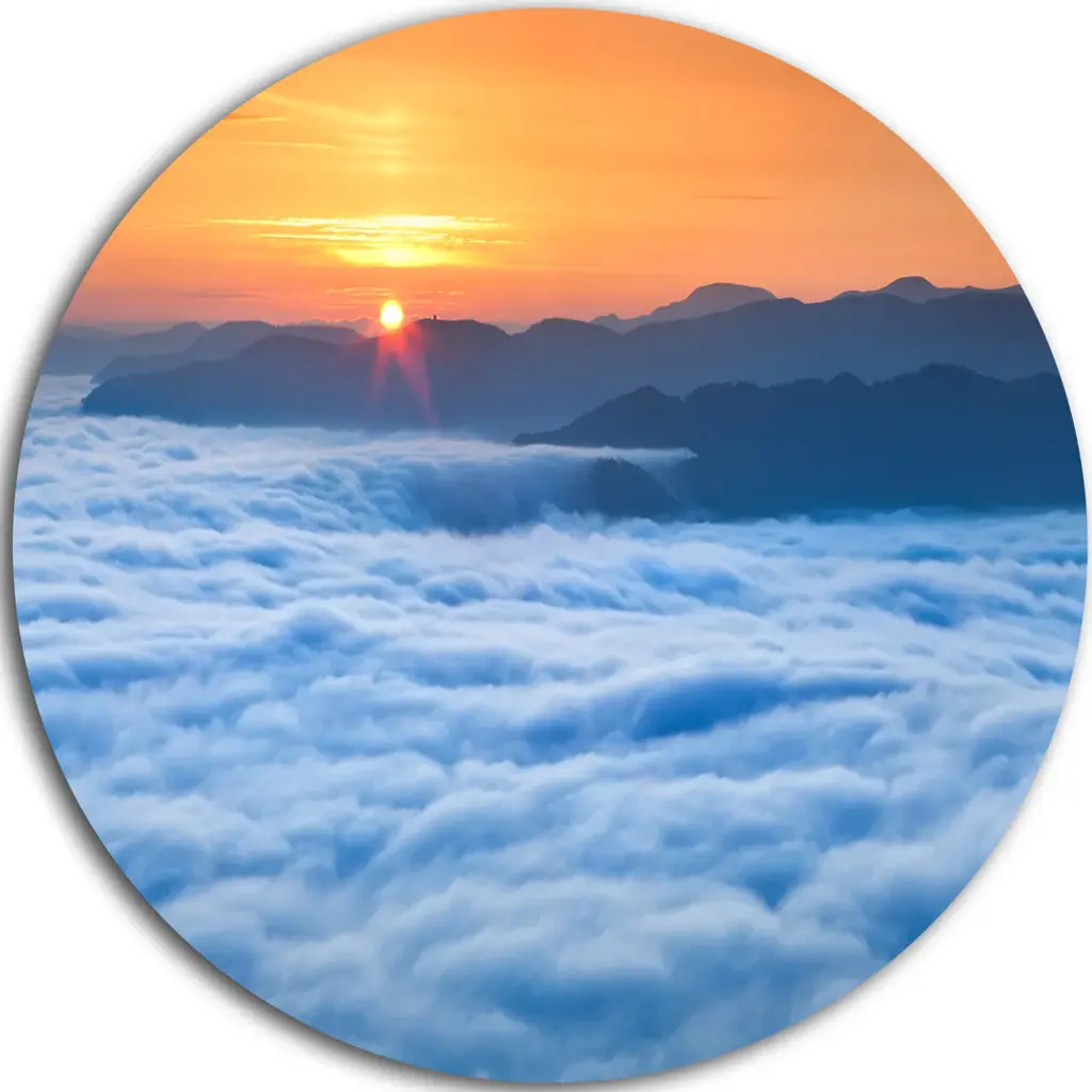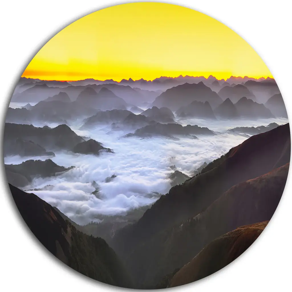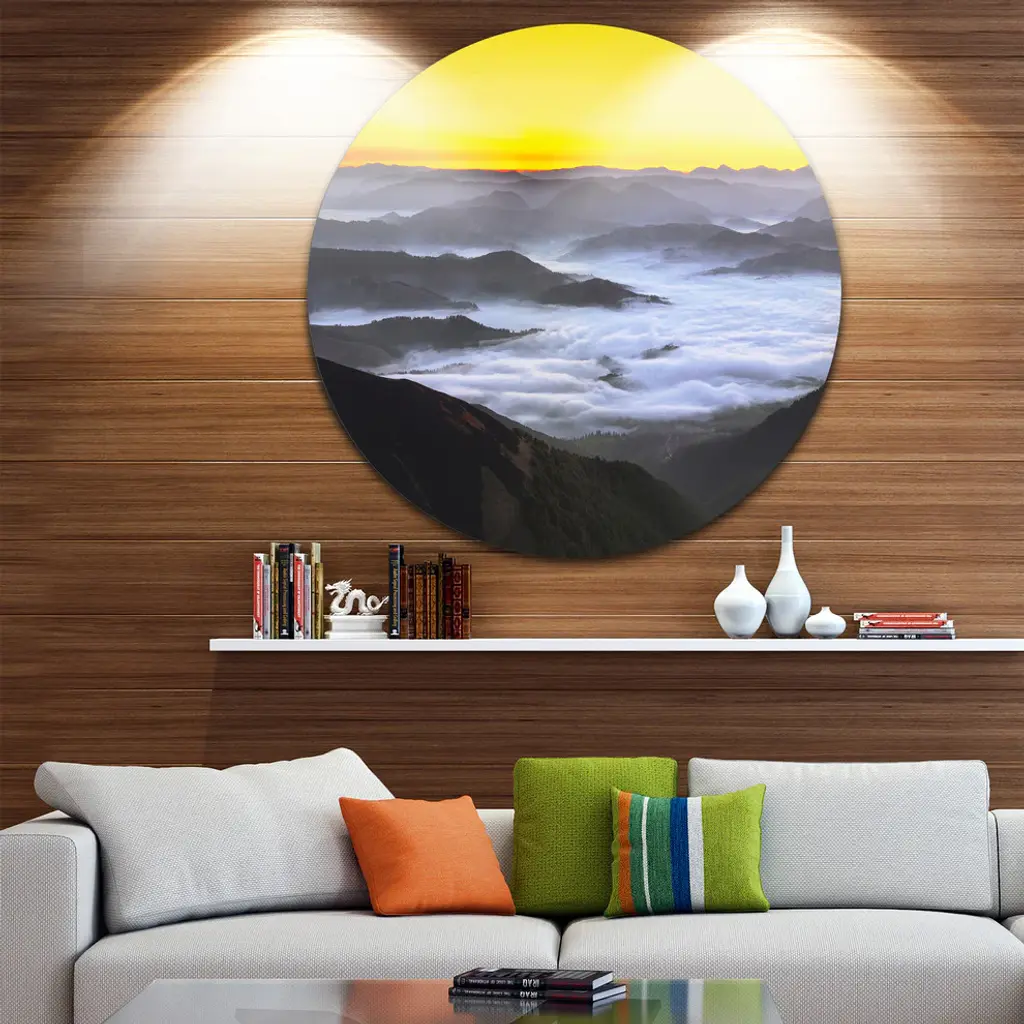 Yellow Sky And Foggy Mountains, Landscape Round Wall Art, 11"