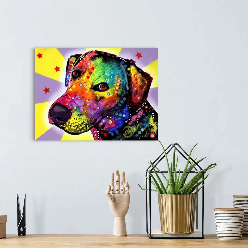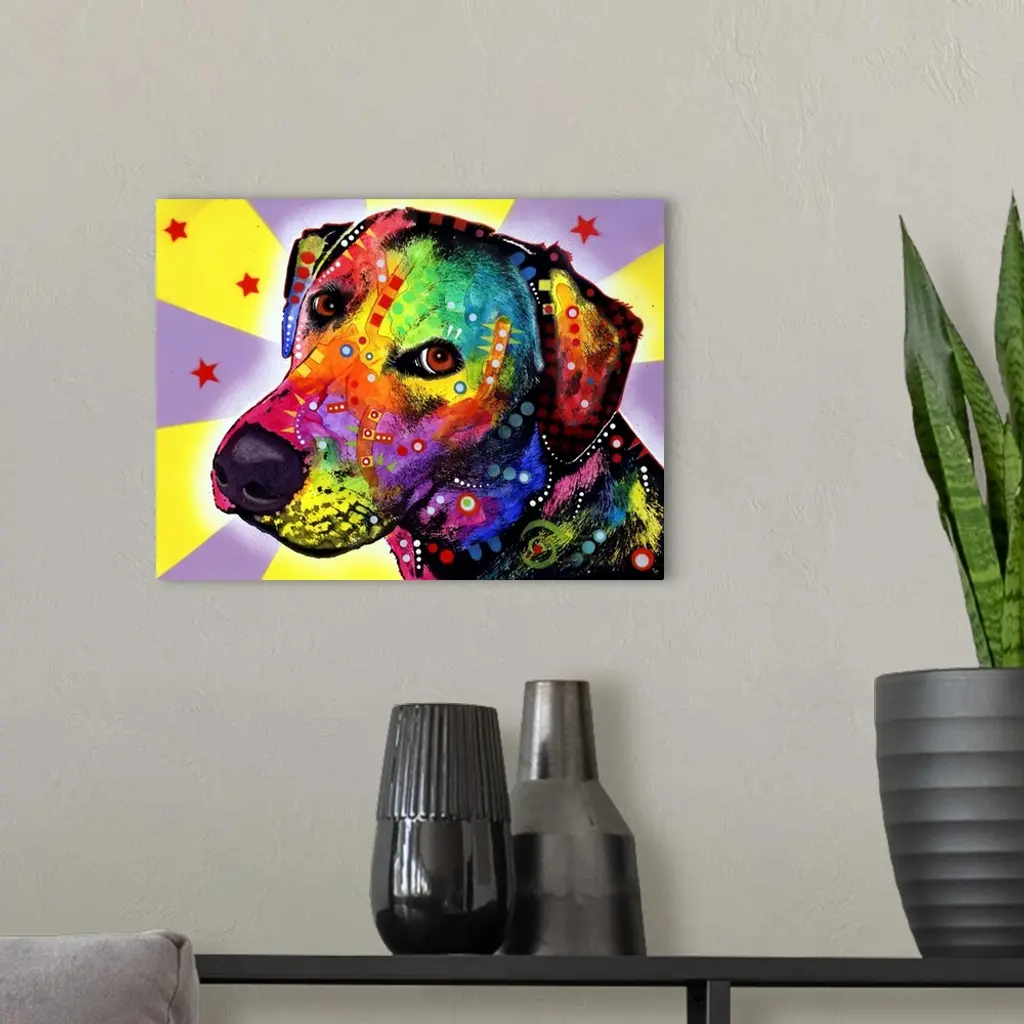 Contemporary stencil painting of a labrador retriever mix filled with various colors and patterns.