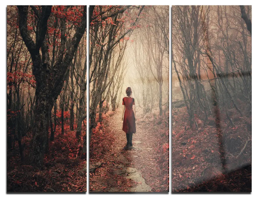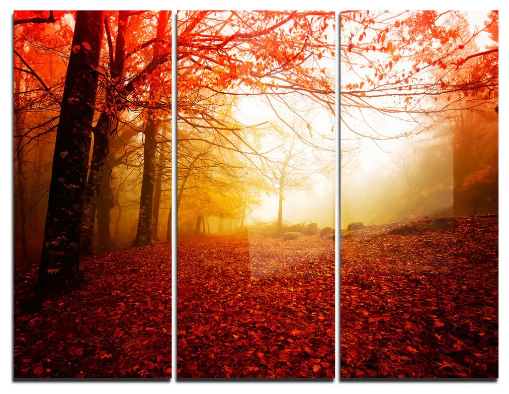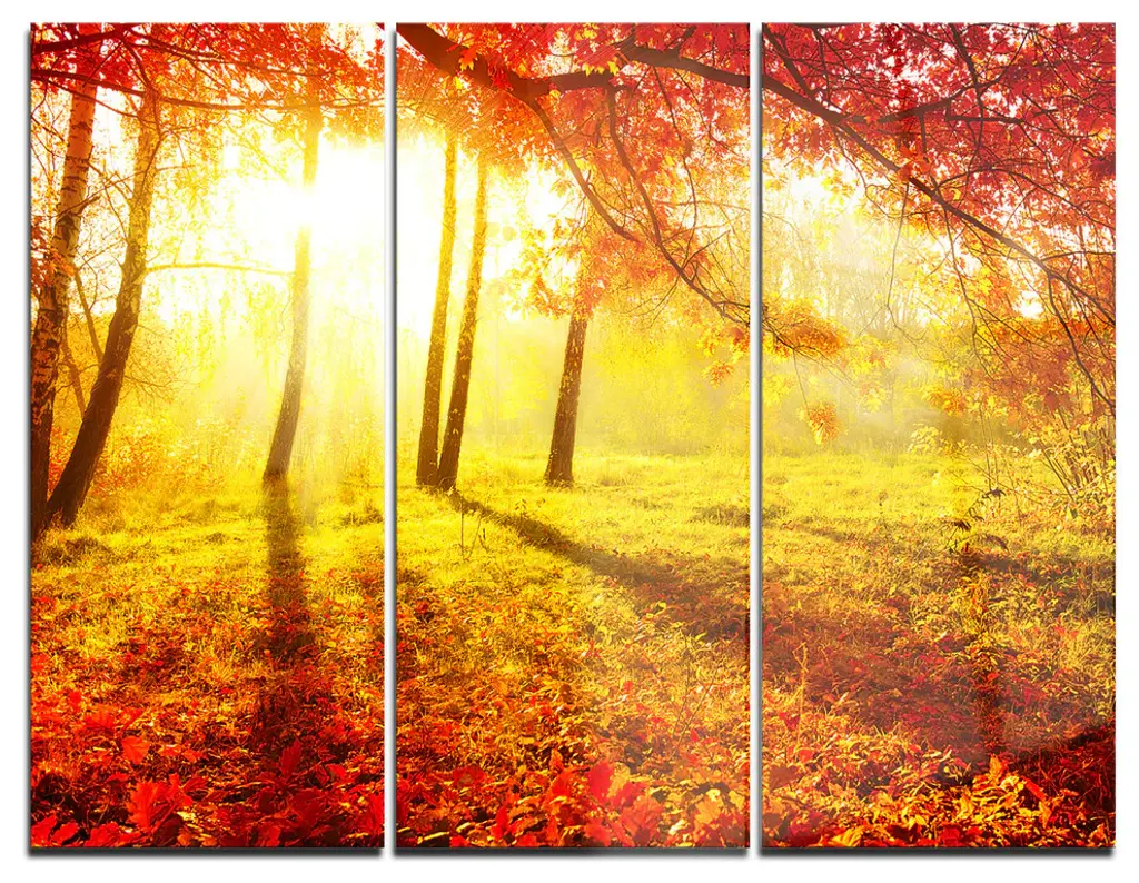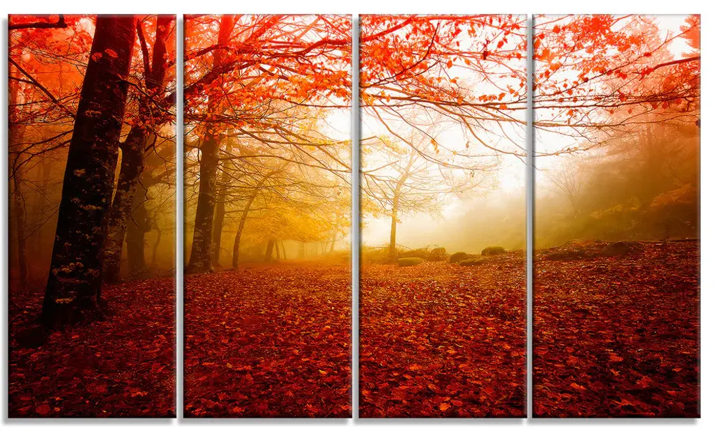 "Yellow Sun Rays In Red Forest" Landscape Canvas Photo Print, 4 Panels, 48"x28"