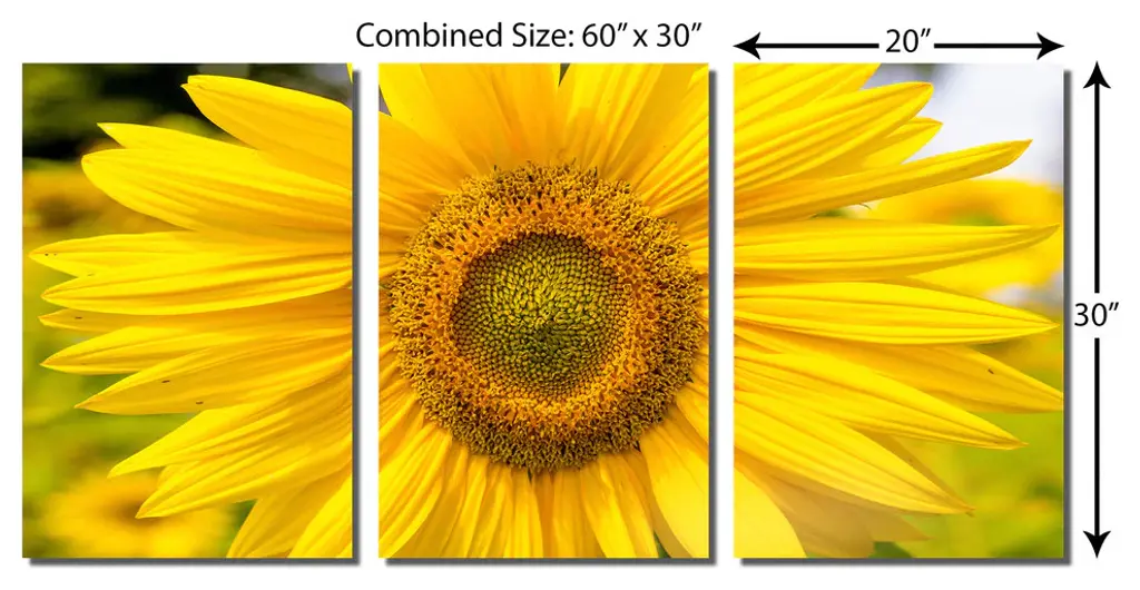 36"œ x 18"œ total size. Ready To Hang! (3 pieces - 12"œ x 18"œ each). 3 Panel Split (Triptych) Metal Print of a Yellow Sunflower close-up. Modern metal wall art for home or office wall decor & interior design. Printed on Luxurious, HD aluminum glossy metal panels. Multi panel art.. HD aluminum panels. Metal print wall art. Includes Shadow Wall Mount on the back.• Aluminum Metal Wall Art• Made in USA• Ready to hang - No assembly required• Shadow mount hardware on the back• 0.045"œ thick HD Aluminum Panels• Scratch resistant, glossy finish• Superb color clarity, luxurious prints• Epson printing process• For indoor or moisture rich environment use• Easy to clean. Gently wipe with microfiber cloth.