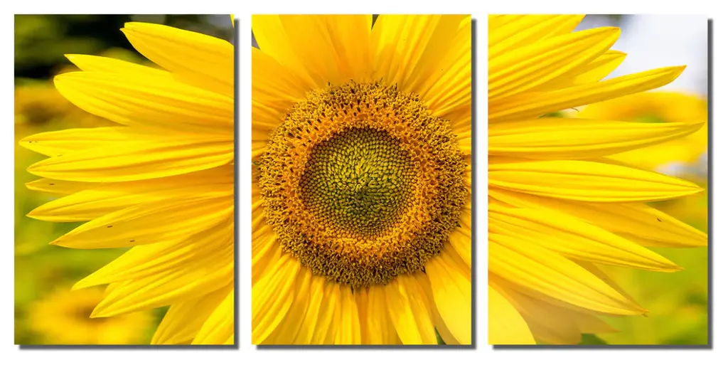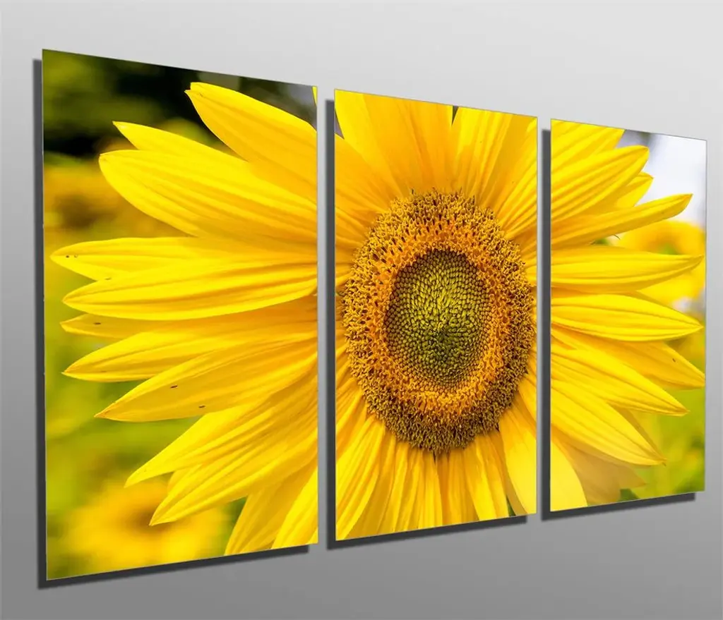 48"œ x 24"œ total size. Ready To Hang! (3 pieces - 16"œ x 24"œ each). 3 Panel Split (Triptych) Metal Print of a Yellow Sunflower close-up. Modern metal wall art for home or office wall decor & interior design. Printed on Luxurious, HD aluminum glossy metal panels. Multi panel art.. HD aluminum panels. Metal print wall art. Includes Shadow Wall Mount on the back.• Aluminum Metal Wall Art• Made in USA• Ready to hang - No assembly required• Shadow mount hardware on the back• 0.045"œ thick HD Aluminum Panels• Scratch resistant, glossy finish• Superb color clarity, luxurious prints• Epson printing process• For indoor or moisture rich environment use• Easy to clean. Gently wipe with microfiber cloth.