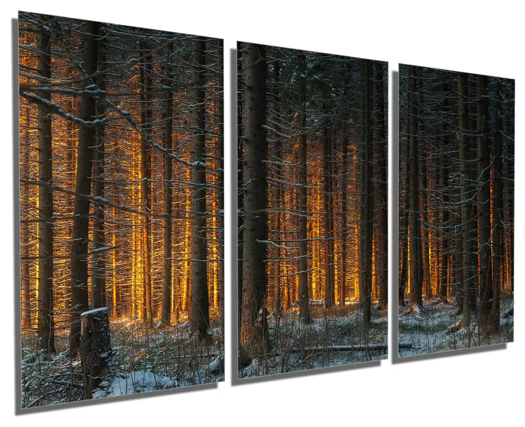 60" x 30" total size. Ready To Hang! (3 pieces - 20" x 30" each). 3 Panel Split (Triptych) Metal Print of yellow sunlight piercing into a dark, creepy forest. Modern metal wall art for home or office wall decor & interior design. Printed on Luxurious, HD aluminum glossy metal panels. Multi panel art.. HD aluminum panels. Metal print wall art. Includes Shadow Wall Mount on the back.• Aluminum Metal Wall Art• Made in USA• Ready to hang - No assembly required• Shadow mount hardware on the back• 0.045" thick HD Aluminum Panels• Scratch resistant, glossy finish• Superb color clarity, luxurious prints• Epson printing process• For indoor or moisture rich environment use• Easy to clean. Gently wipe with microfiber cloth.