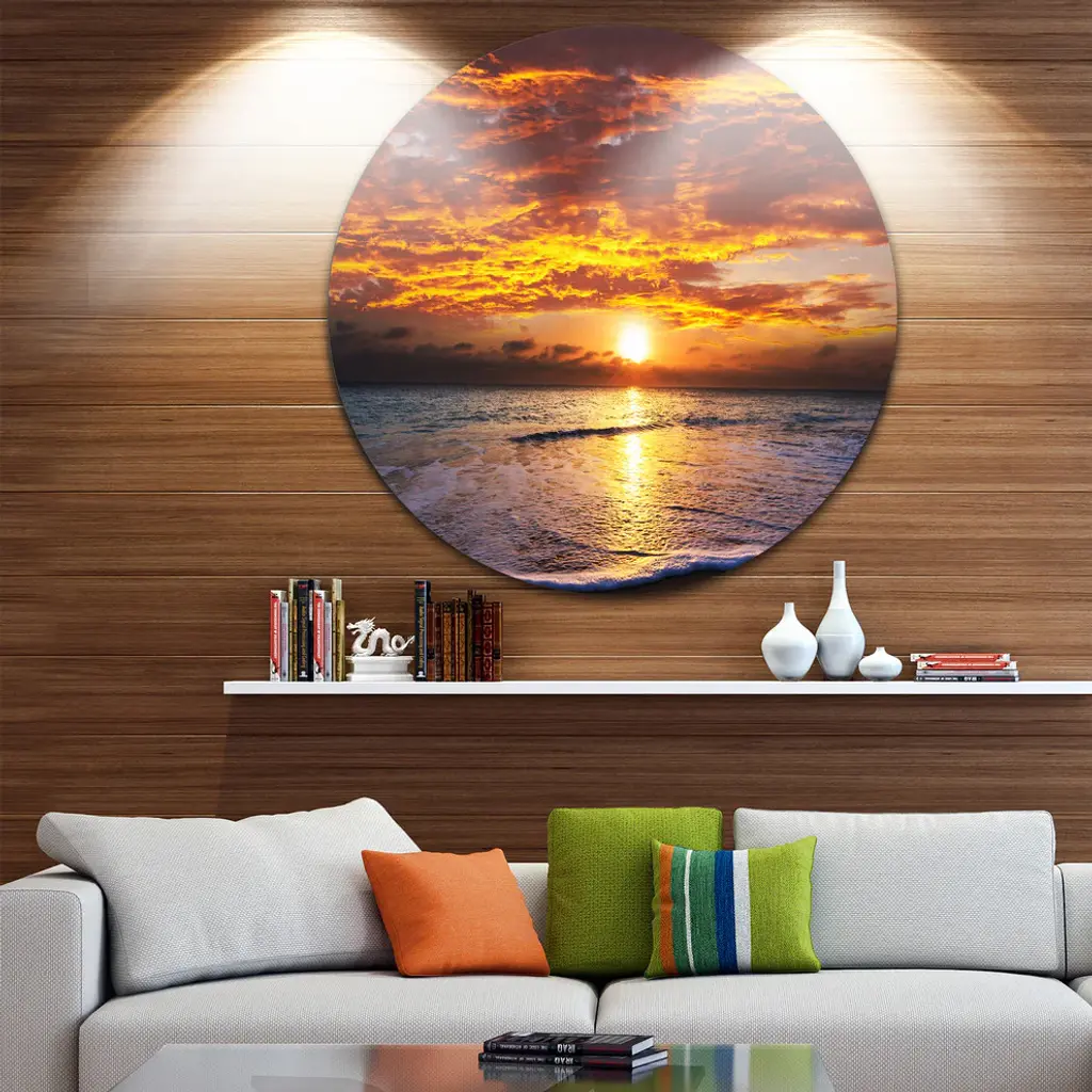 Yellow Sunset Above Foaming Waves, Beach Large Disc Metal Wall Art, 23"