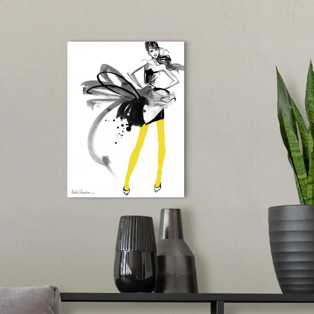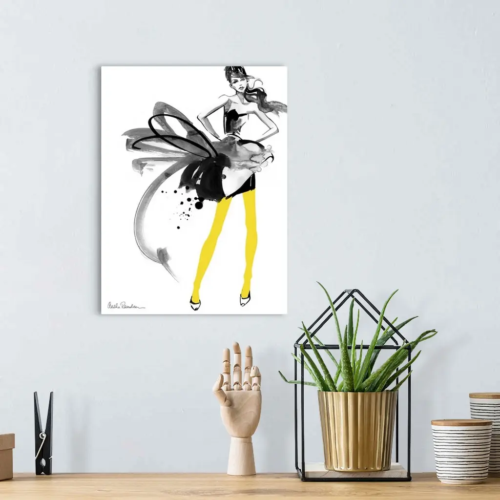 Contemporary fashion artwork of a woman wearing a decorative dress with bright yellow tights.