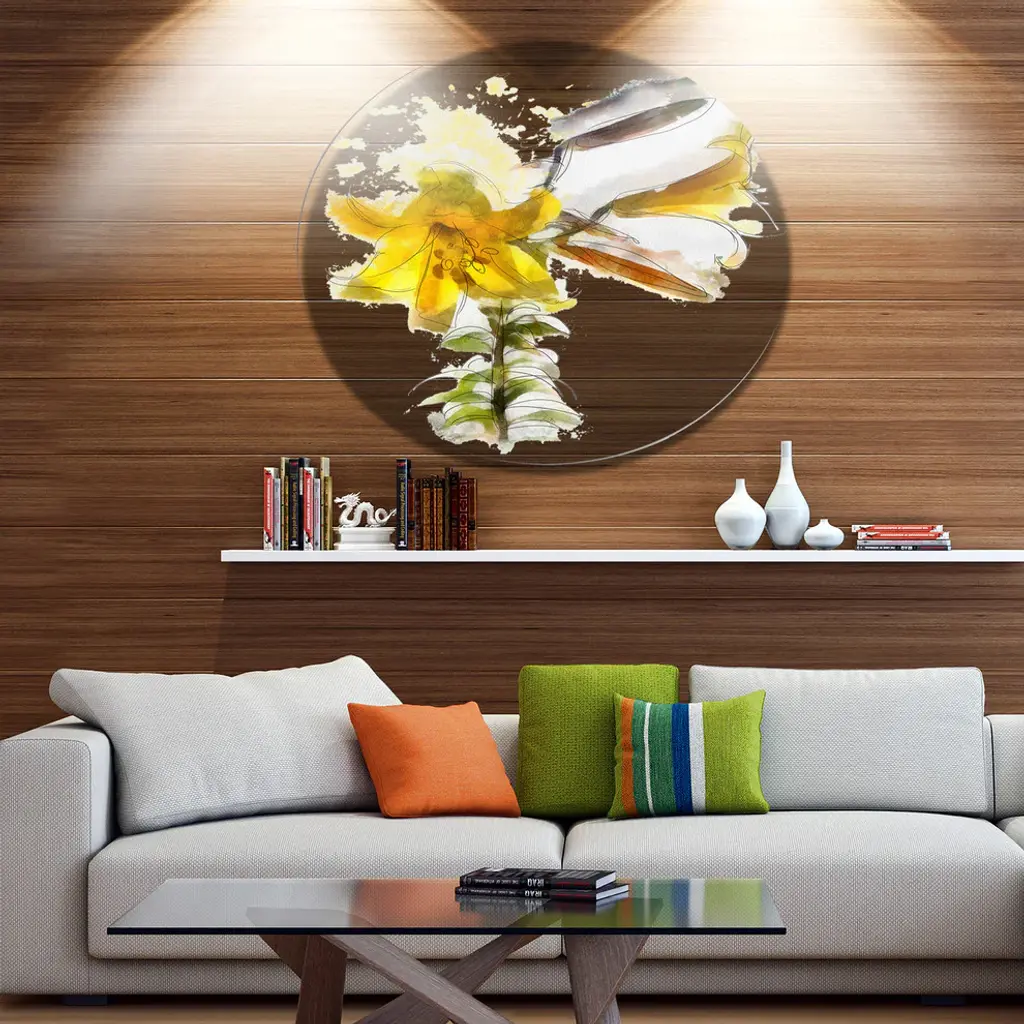 Bring Contemporary Abstraction to your home with this large Circle Metal wall art. This Yellow Tulip Stem with Leaves Metal Artwork makes it the focal point of any room or office. - White Gloss Coating ensures colors are extra vibrant with light reflection.- Aluminum grade Sheet Metal with 1 inch mounting frame on the back giving the illusion that the artwork is floating on the wall..- Mounting Brackets are included along with instructions.- High Quality Digital images are created directly into a glossy aluminum panel producing a stunning and captivating print into the glossy finish of the metal.- Water, Fire and Scratch resistant HD Aluminum panels.- Looks better than any photo paper and guaranteed to last at least 20 years- Easy to clean with a microfiber cloth. Colors are far superior to regular Canvas Art. - Easy to Hang