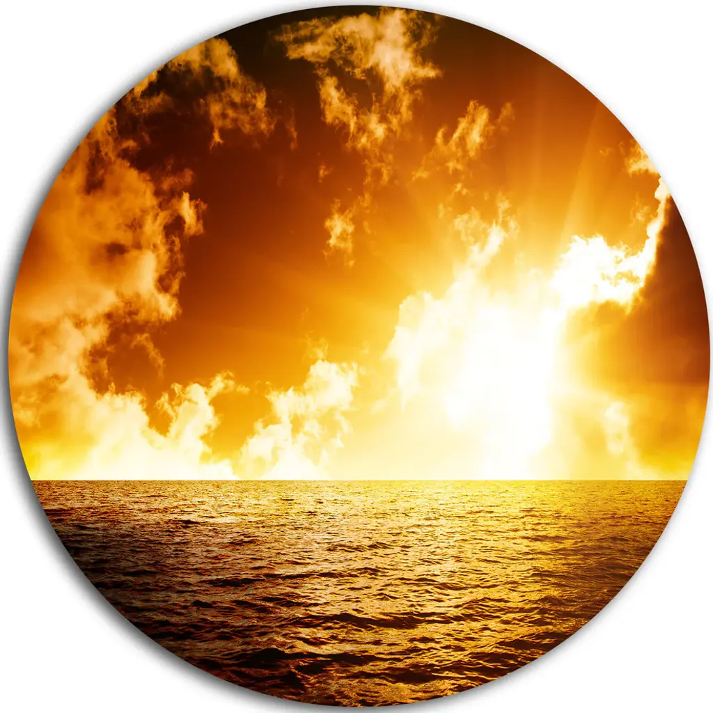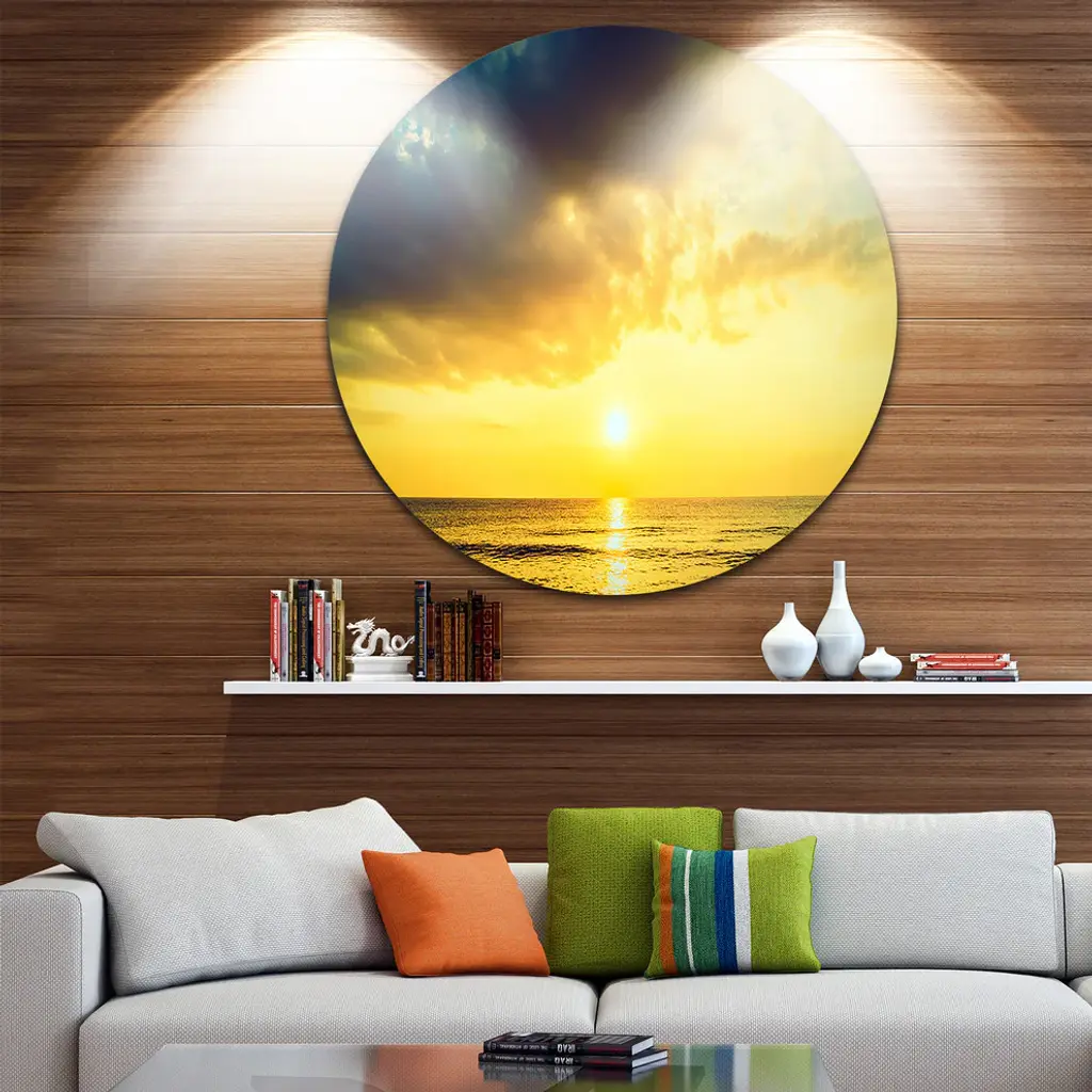 Bring Contemporary Abstraction to your home with this large Circle Metal wall art. This Yellowish Sky over Serene Seashore Metal Artwork makes it the focal point of any room or office. - White Gloss Coating ensures colors are extra vibrant with light reflection.- Aluminum grade Sheet Metal with 1 inch mounting frame on the back giving the illusion that the artwork is floating on the wall..- Mounting Brackets are included along with instructions.- High Quality Digital images are created directly into a glossy aluminum panel producing a stunning and captivating print into the glossy finish of the metal.- Water, Fire and Scratch resistant HD Aluminum panels.- Looks better than any photo paper and guaranteed to last at least 20 years- Easy to clean with a microfiber cloth. Colors are far superior to regular Canvas Art. - Easy to Hang