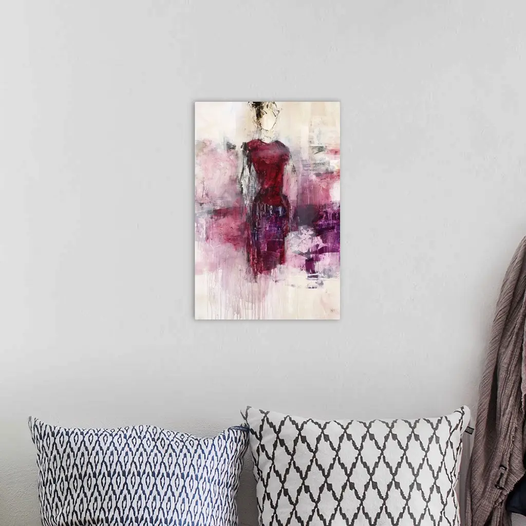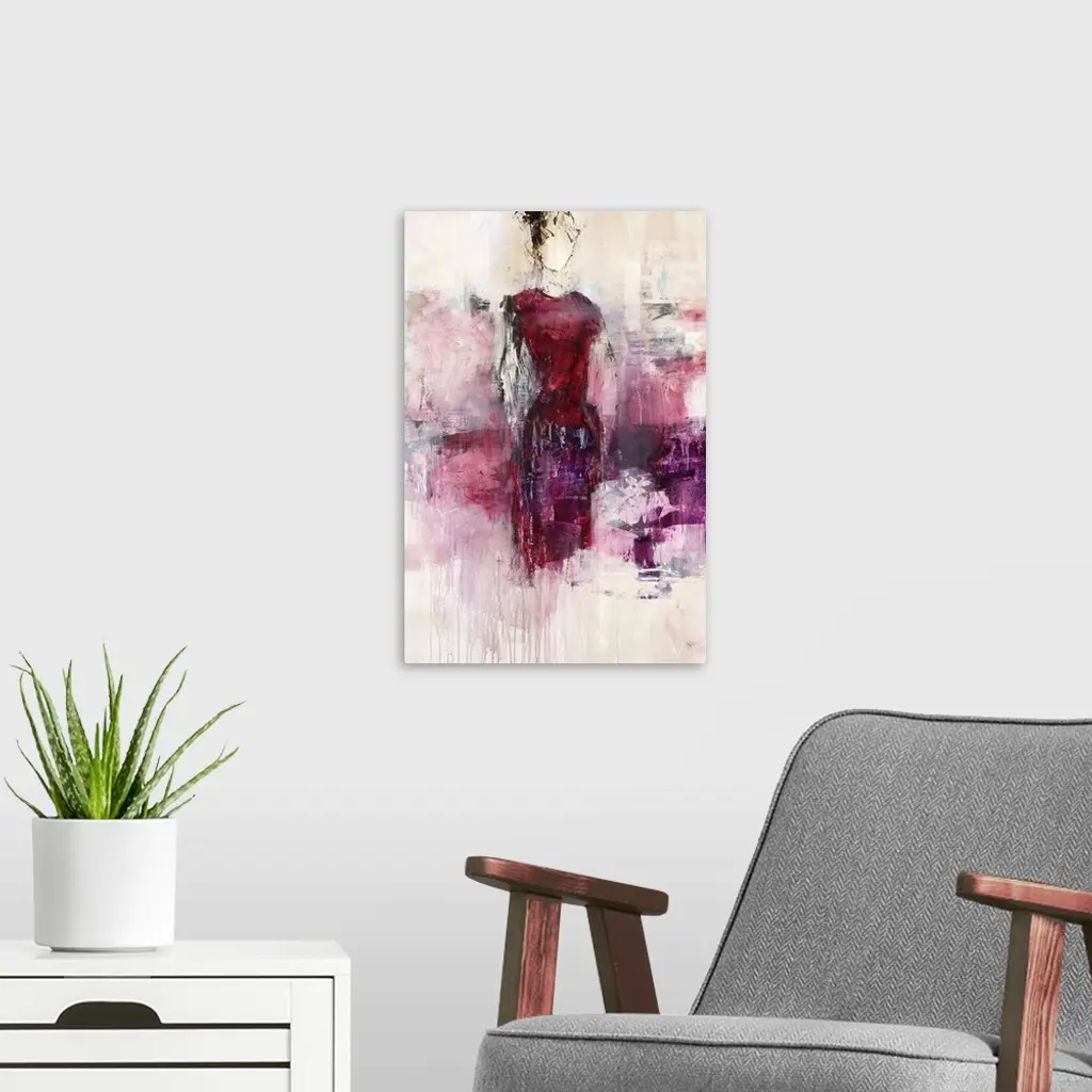 Contemporary figurative painting of a woman wearing a purple dress surrounded by an ethereal smokey purple haze.