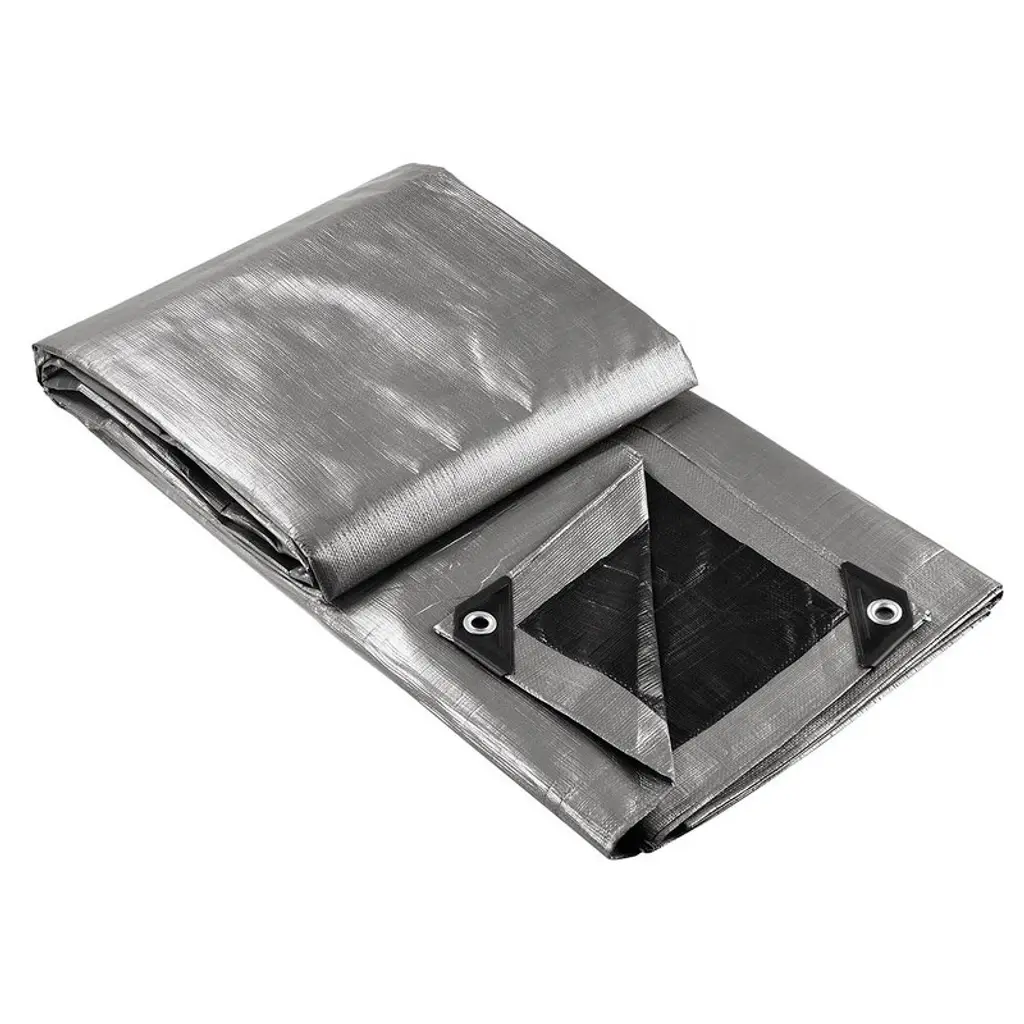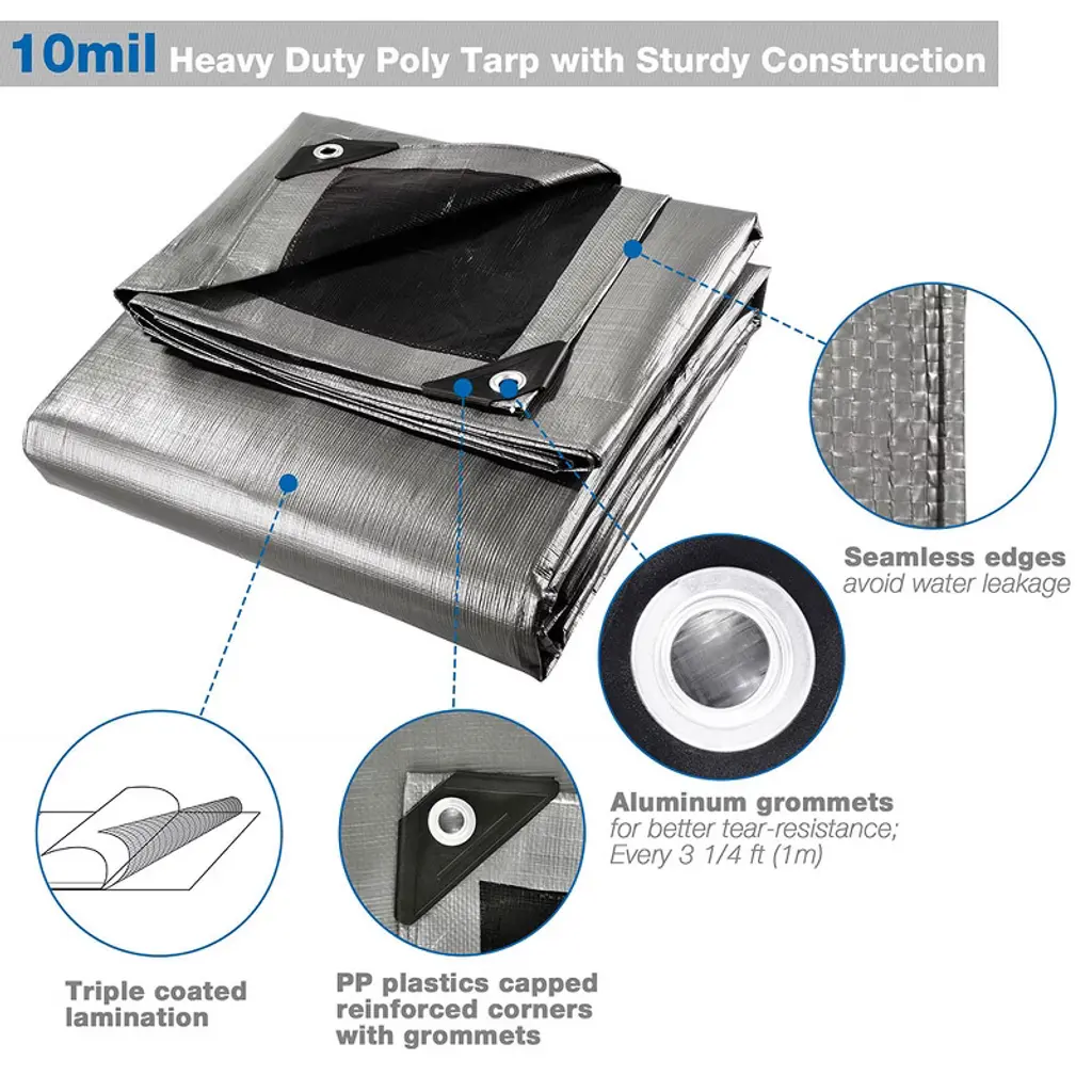 Features:- Strong & Durable Shelter - 10 x 15 ft silver and black poly tarp forms a strong and durable shelter from sunlight, rain and dust, cooler underneath in the summer; Long lifetime up to 3 years, it features good ability of anti-aging for long-time use- Waterproof and UV Resistant Double-side Used Cover - Made of 100% brand-new PE material and triple coated lamination for double-sided use, silver layer for resisting sunlight in sunny day, black layer for maintaining heat in cold day, both side for waterproofing, UV resistance & not easy to get black stains in wet weather- Heavy Duty Sturdy Poly Tarp - Weights 5.07lbs, 10mil heavy-duty thickness and aluminum grommets in 3 1/4 ft (1m) interval for better tear-resistance; PP plastics capped reinforced corners with grommets for sturdy construction; All seamless edges avoid water leakage - Versatile Using - Great For Protecting bicycles, wood, camper, car, shelter boats from rain or UV; Ideal for general pergola canopies, cover tent fly, carport cover, camping ground sheet, car covers, boat covers, machine covers, wind protectors, privacy walls, picnic mats and pool cover.Can be used indoors to protect products in your store from dust and moisture, or cover your floors, furniture, carpets when painting or polishing - Warm Tips - Available in 15 sizes for opt in list; Please measure your item's size first, to ensure the cloth big enough for your item's sides for a full protection; Overall Finished Size(LxH): 114 1/4" x 176 1/16" (290.17 x 447.14 cm)Specifications:- Overall Finished Size(LxH): 114 1/4" x 176 1/16" (290.17 x 447.14 cm)- Material: PE, PP- Color: Sliver Upper and Black Bottom- Net Weight: 5.07 Lbs (2.3 kg)Package Contents:- 1x PE Poly Tarp- 1x ManualNotice: - Please keep product away from fire.- Covered items should be adequately ventilated at all times.