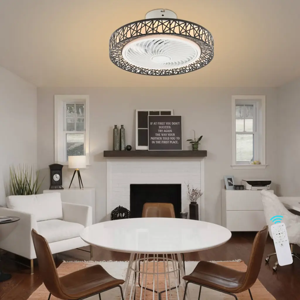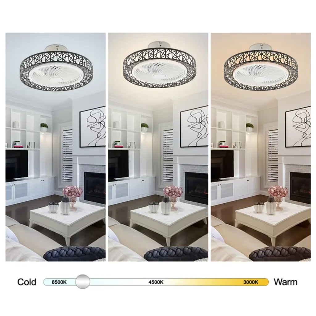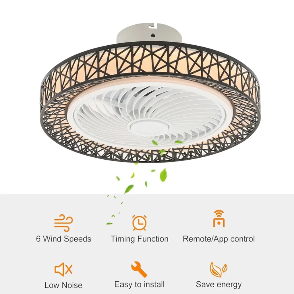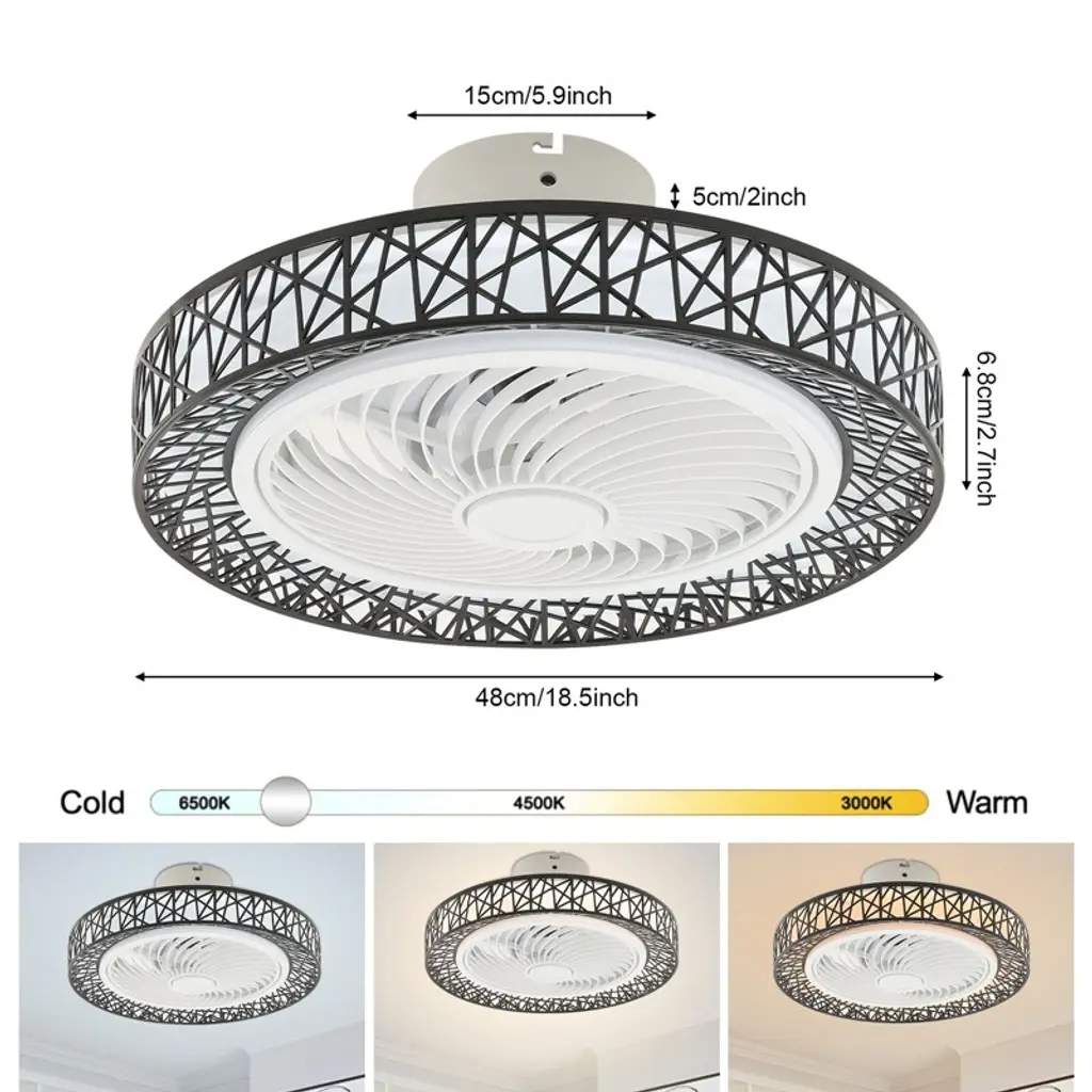 Upgrade your living space with this 18.5-inch LED flush ceiling fan, complete with a dimmable light and remote control. The bird's nest design adds a touch of chic artistry to your room, while the low noise and adjustable wind speeds create a comfortable and quiet environment. The energy-saving LED light comes with 3 color temperature options and the fan has 6 speed settings. With a high-quality protective cover and timing function, this ceiling fan light is perfect for your bedroom, living room, dining room, hotel room or convenience store. Specifications Material: Plastic, Acrylic, ABSProcess: PaintingStyle: ModernEfficiency: E Shape: RoundMotor Type: Pure Copper MotorMounting Type: Ceiling MountAssembly Required: YesColor: Black, White Indoor/Outdoor Usage: Indoor Control Method: Remote(Included), Wall Switch(Not Included) Battery Type: 2* AAA Batteries(Included)Light Source: LED(Included)Light Color: White Light, Warm Light, Neutral LightColor Temperature Range: 3000K, 4500K, 6000KNumber of Fan Blades: 5Remote Control Distance: 3-5m/9.84-16.4ftTiming: 1/2/4/8H Noise: 35dBLight Power: 48WMotor Power: 35WApplicable Area: 15m²/161.46ft² Voltage: 85-265VWind Speed Gears: 6Chassis Size(D*H): 15*5cm/5.9*2inLampshade Size(D*H): 48*6.8cm/18.5*2.7in