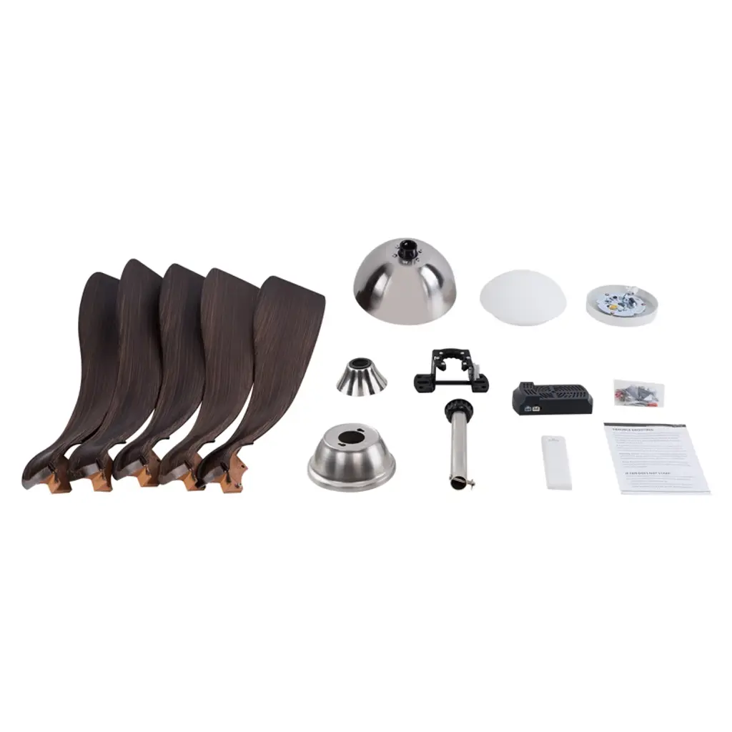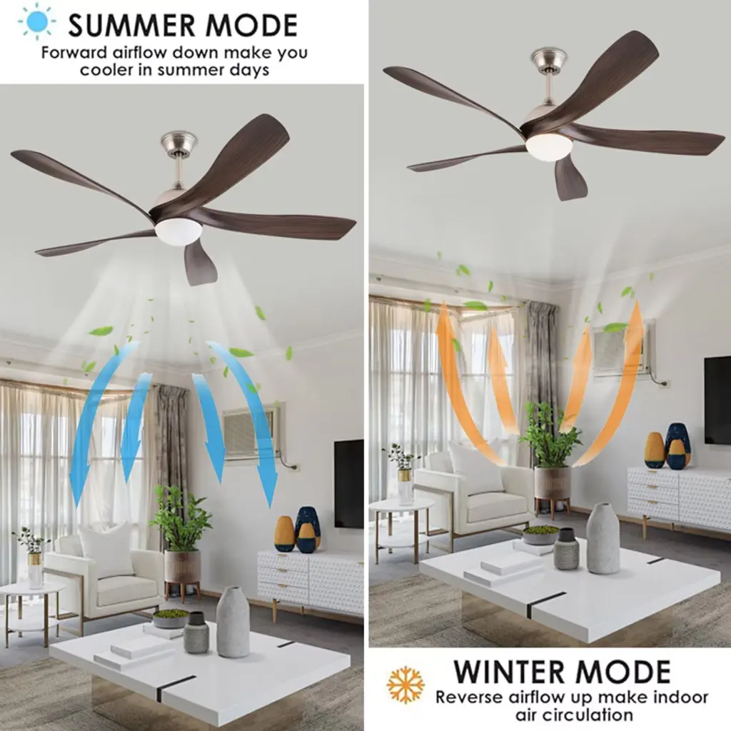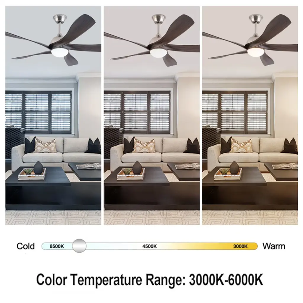 Experience the perfect blend of comfort and style with this modern ceiling fan light, designed to enhance your home year-round. Featuring a powerful yet whisper-quiet pure copper motor, it offers six adjustable wind speeds and a reversible function to provide a cooling breeze in the summer and help circulate warm air in the winter. The integrated LED light offers three color temperatures (warm, neutral, and white) to create the ideal ambiance for any occasion. Its sleek black finish and minimalist design seamlessly complement various decor styles, making it a versatile and energy-efficient addition to any bedroom, living room, or office. Specifications Material: Hardware, Iron, ABSProcess: PaintingColor: Black/BrownEfficiency: EAssembly Required: YesLight Source: LED(Included)Motor Type: Pure Copper MotorForward and Reverse Function: YesControl: Remote(Included), Wall Switch(Not Included)Mount Type: Ceiling MountIndoor/Outdoor Usage: IndoorStyle: ModernLight Colors: White, Warm, NeutralTiming: 1/2/4HWind Speed Gears: 6Remote Control Battery Type: 2*AA Batteries(Included)Color Temperature: 3000-4500-6000KLuminous Flux: 2200LMMotor Power: 35WLight Source Power: 24WVoltage: 85-265VNoise: 35dBRemote Control Distance: 3-5m/9.84-16.4ftIrradiation Area: 8-15m²/86.11-161.46ft²Fan Suitable Area: 15-20m²/161.46-215.28ft²Gross Weight: 7.7kg/16.98lbsNet Weight: 6.5kg/14.33lbsBase Diameter: 15cm/5.91inSuspension Rods Height: 12cm/4.72in, 20cm/7.87inOverall Product Length: 132cm/52inShow less