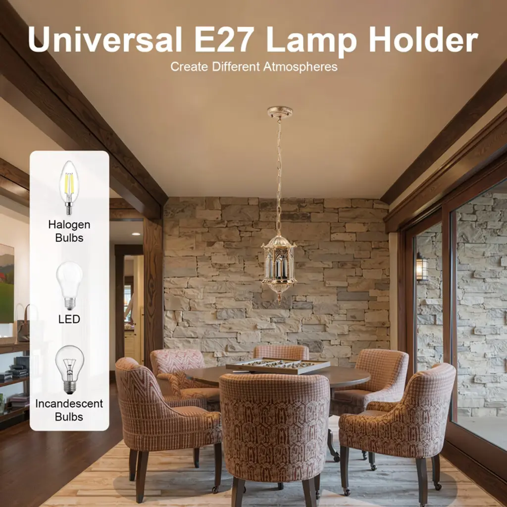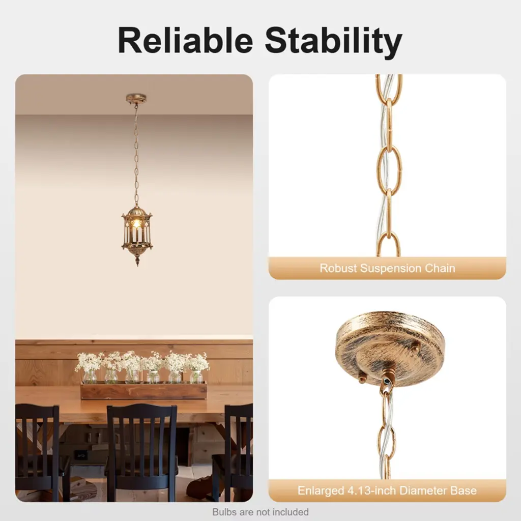 This exquisite pendant light will not only bring light and warmth to your life but also add interest to your room. The creative cage-style design and antique bronze metal appearance give it a strong industrial retro style, adding a beautiful visual effect to the room. In addition, it has IP44 protection capability for both indoor and outdoor use. It is not only a practical light but also a beautiful decorative piece. Specification Color: Antique Bronze Style: Vintage Material: Die-casting Aluminum, Iron, Glass Process: Plastic Spraying, High-temperature Baking Paint, Manual Painting Mounting Type: Ceiling Mount Indoor/Outdoor Usage: Indoor, Outdoor Light Fixture Form: Pendant Light Power Source: Wired Light Source: 1* E27 Bulb(Not Included) Power Supply: 110V~220V Efficiency: E Protection Level: IP44 Chain Length: 45cm/17.72in Chassis Diameter: 10.5cm/4.13in Lampshade Size(D*H): 15.5*29cm/6.1*11.42in