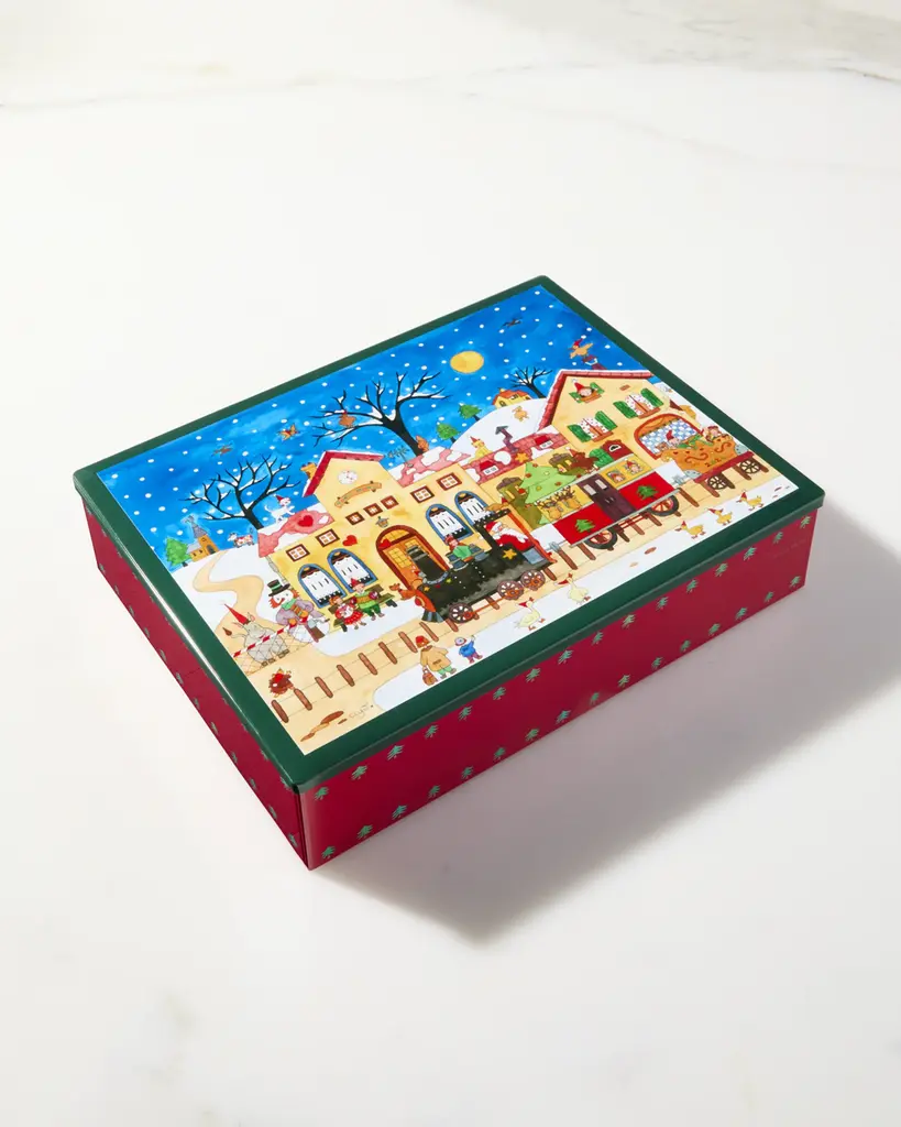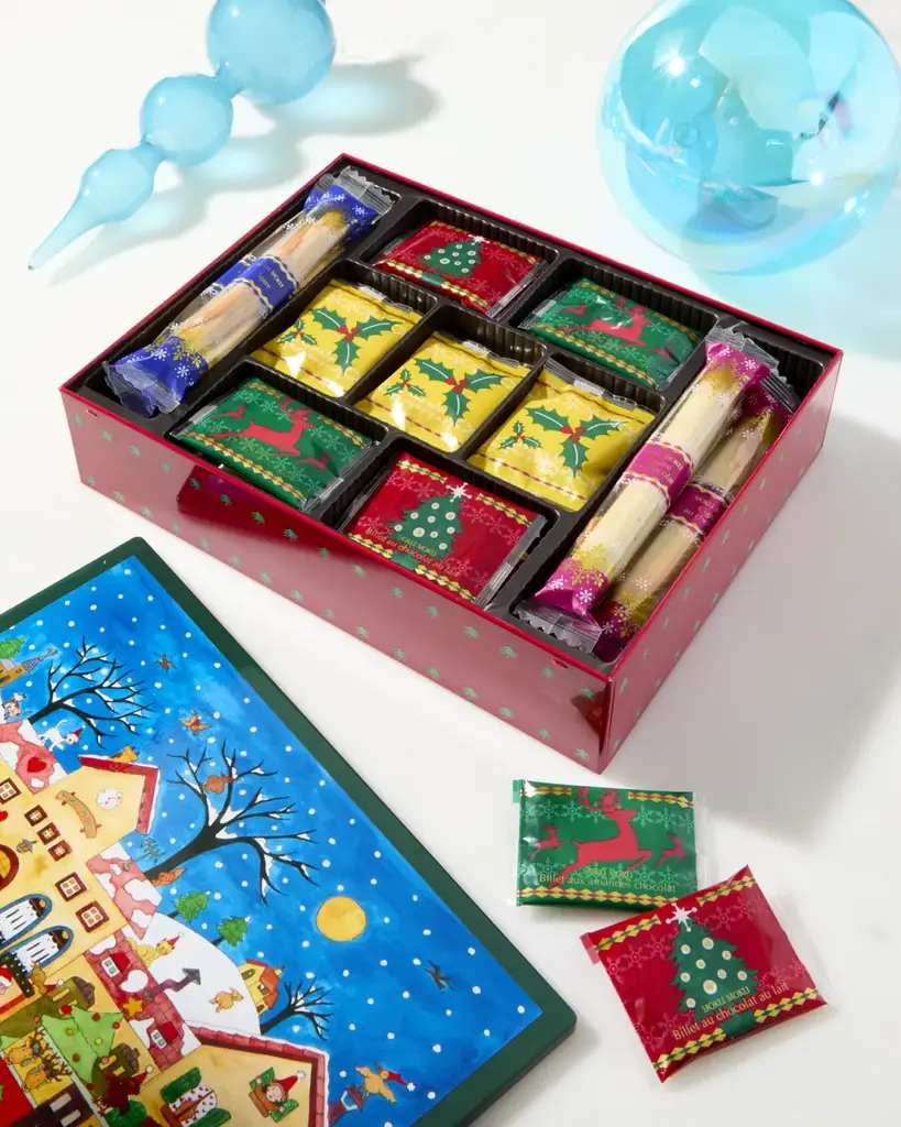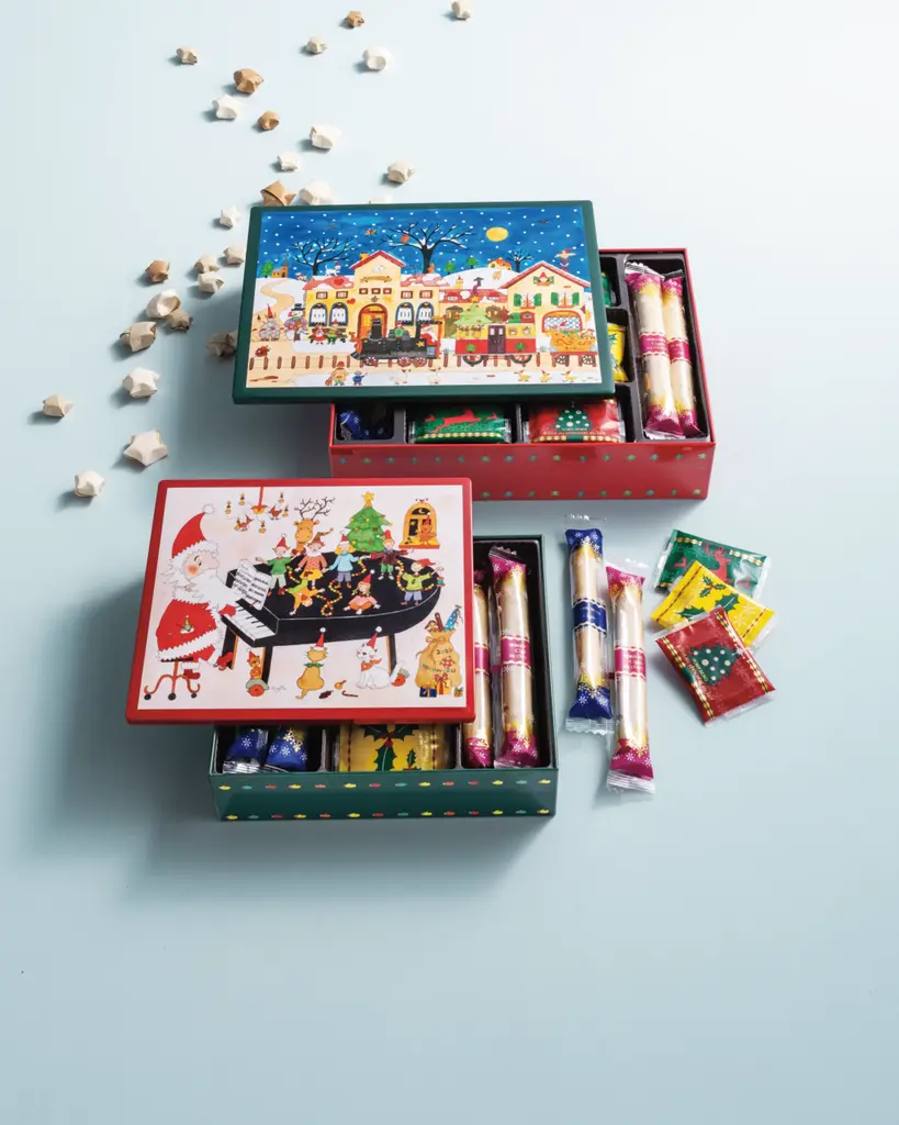 Original artwork created new each year, exclusively for YOKU MOKU by Clyv. Assortment of five types of light butter cookies in holiday motif. Includes 46 individually wrapped cookies in a signature tin. Cookies: 6 Cigare, 4 Cigare au chocolat, 12 Billet au chocolat au lait, 12 Billet aux amandes chocolat, 12 Pleine lune. Net wt. 13.71 ounces. Tin, approx. 10.5"L x 8.25"W x 2.4"H Shelf life, 6 months from production. Store in a cool place. Made in Japan. Ingredients: Butter (Milk), Milk chocolate (Sugar, Cocoa butter, Whole milk powder, Cocoa mass, Soy lecithin an emulsifier, Natural and artificial chocolate flavor), Sugar, Wheat flour, Egg whites, Almonds (Almond powder, Sliced almonds), Sugared egg yolk (Egg yolk, Sugar), Milk, Natural vanilla flavored extract. Allergens: Milk, Egg, Almond, Wheat, SoyContains allergens: Milk, soybeans, wheat, almonds, and eggs About Yoku Moku: These all-natural butter creations are made in Tokyo and contain no additives, preservatives, or chemicals. And that unusual name? Chocolatier Noriichi Fujinawa named his company "Yoku Moku" after Jokkmokk, a village in northern Sweden where he first tasted and fell in love with European-style butter cookies over 30 years ago.