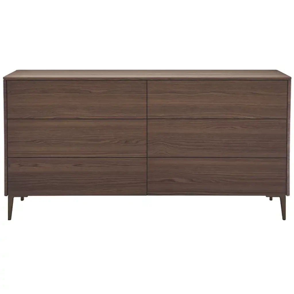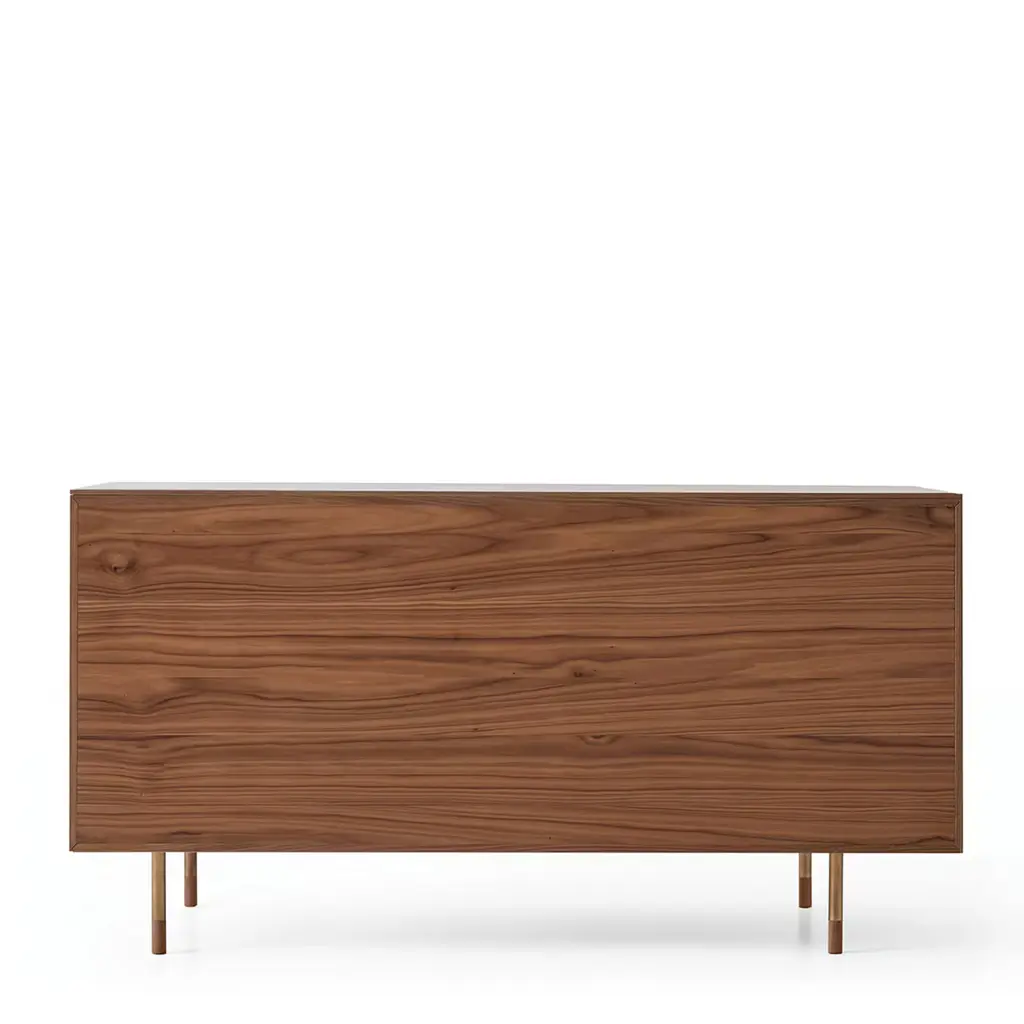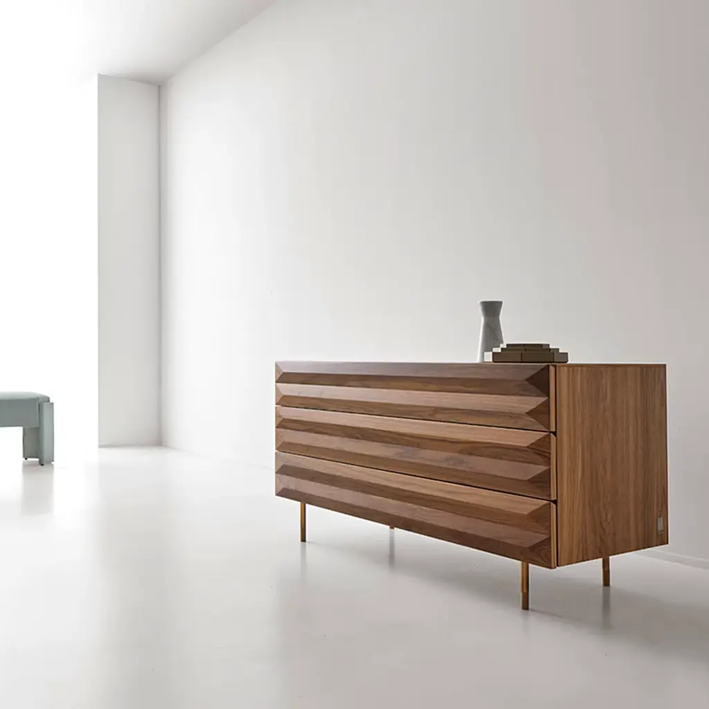A chest of 3 drawers with a faceted front in retro-finished solid wood that is also suitable for the center of the room. Ecological water-based painting. wood. The feet are cylindrical in bronze-colored metal and end with a wooden tip. Canaletto Havana finish and Bronze metal feet.