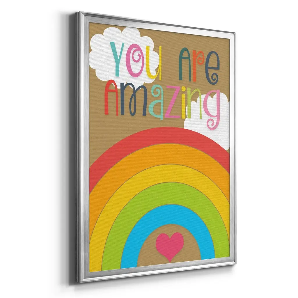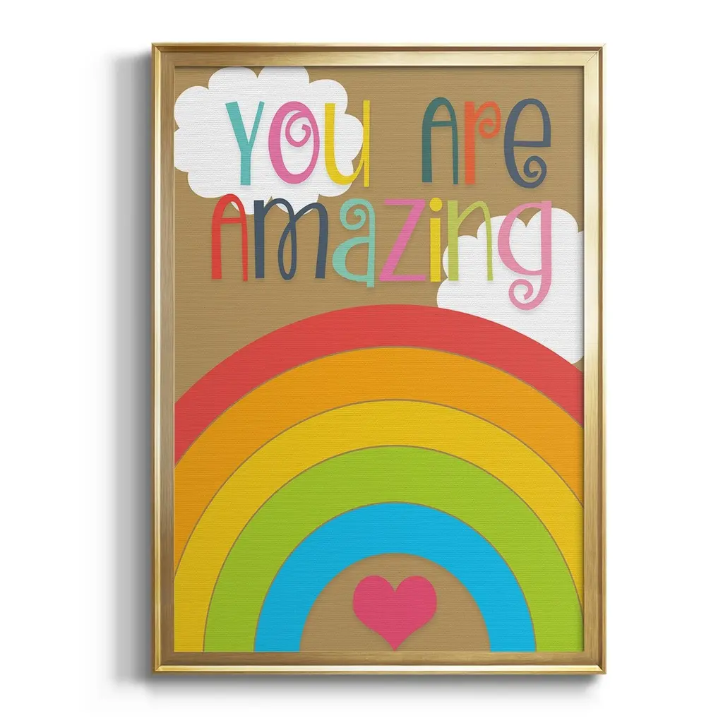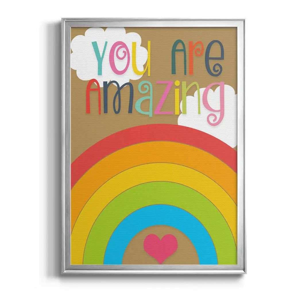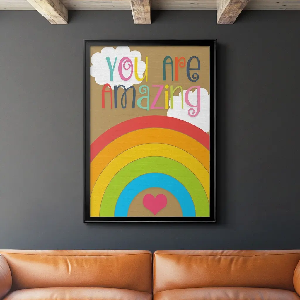 You Are Amazing Premium Framed Print - Ready to Hang A Premium Framed Print created to last. Framed in distressed wood and available in an array of sizes and colors Featuring a beveled a solid wood stretcher bar, each piece comes ready to hand 4 SIZES AVAILABLE 30.5''X42.5'' - Overall Size 26.5'X36.5'' - Overall Size 22.5''x30.5'' - Overall Size 18.5''x24.5'' - Overall Size Each piece is made to order. Each piece comes with hanging hardware. Made in the USA Ready to Hang