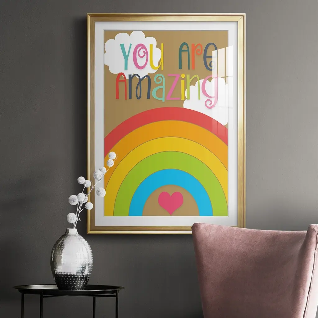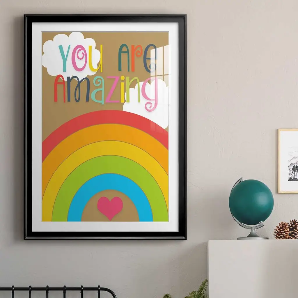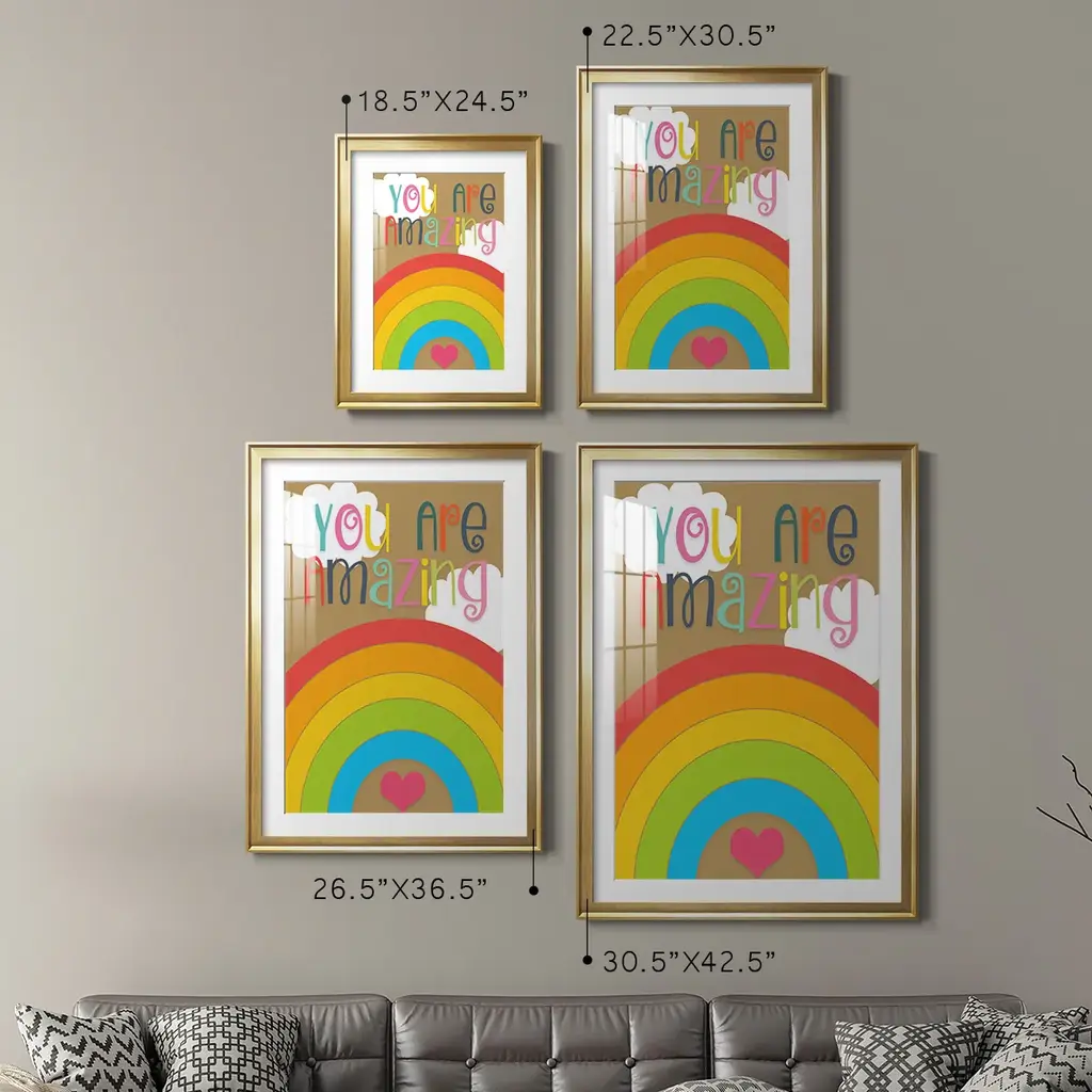 You Are Amazing Premium Framed Print - Ready to Hang A Premium Framed Print created to last. Framed in distressed wood and available in an array of sizes and colors Featuring a beveled a solid wood stretcher bar, each piece comes ready to hand 4 SIZES AVAILABLE 30.5''X42.5'' - Overall Size 26.5'X36.5'' - Overall Size 22.5''x30.5'' - Overall Size 18.5''x24.5'' - Overall Size Each piece is made to order. Each piece comes with hanging hardware. Made in the USA Ready to Hang Giclee Paper Print Acrylic Glass Beveled Matt Board