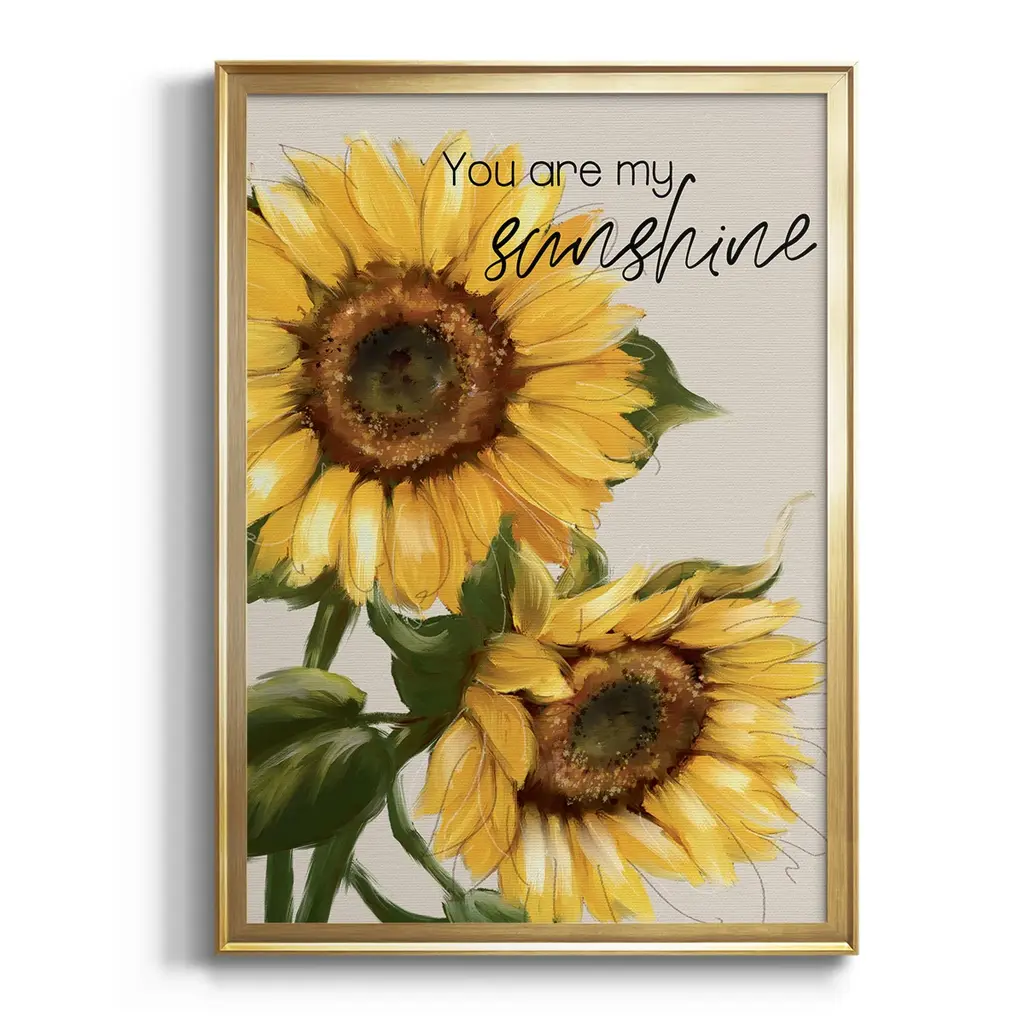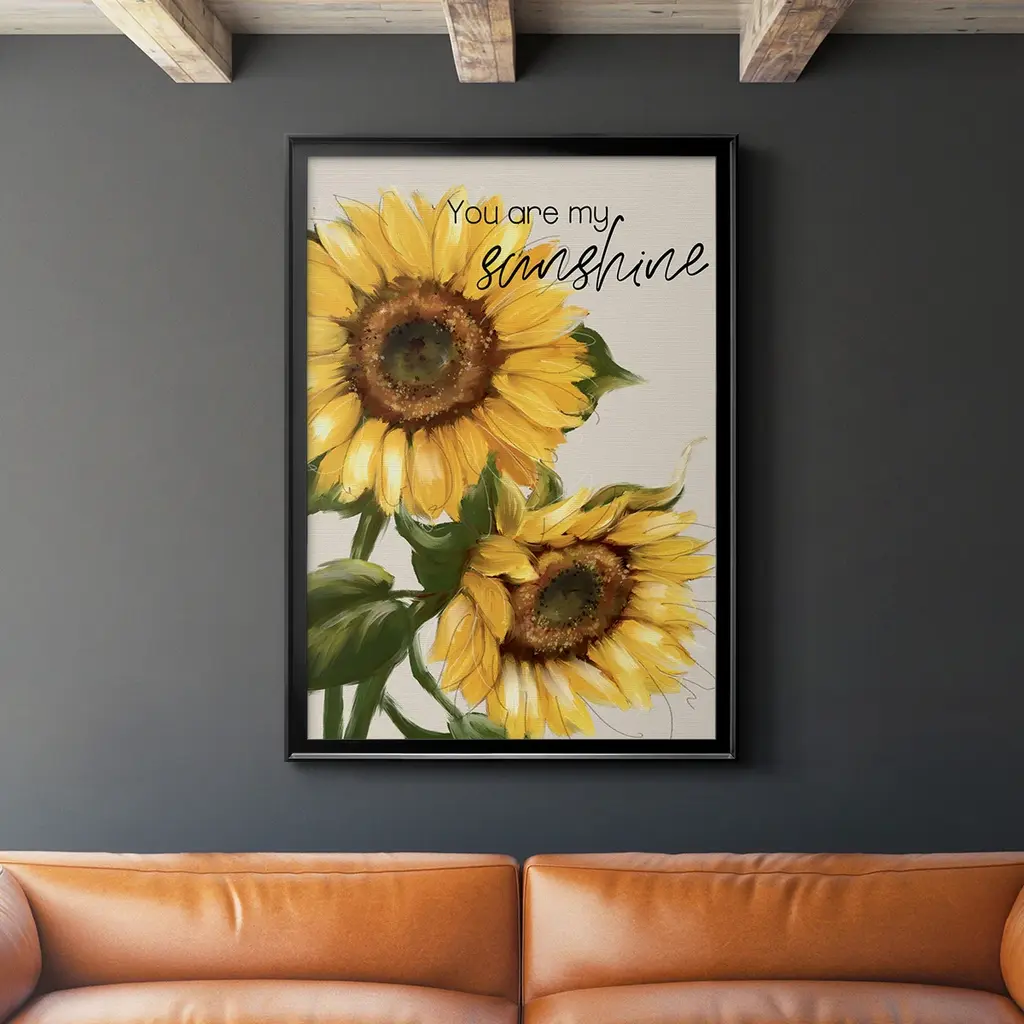 You Are My Sunshine Premium Framed Print - Ready to Hang A Premium Framed Print created to last. Framed in distressed wood and available in an array of sizes and colors Featuring a beveled a solid wood stretcher bar, each piece comes ready to hand 4 SIZES AVAILABLE 30.5''X42.5'' - Overall Size 26.5'X36.5'' - Overall Size 22.5''x30.5'' - Overall Size 18.5''x24.5'' - Overall Size Each piece is made to order. Each piece comes with hanging hardware. Made in the USA Ready to Hang